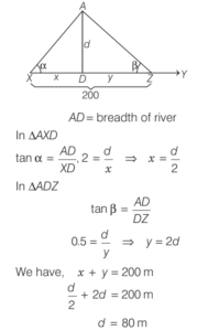 8. A man, standing at a point X on the bank XY of a river that cannot be crossed, observes a tower to be N α° E on the opposite parallel bank. He than walks 200 m along the bank to the point Y towards East, and finds the tower to be N Wβ° . From these observations, the breadth of the river will be (Given that tanα° = 2 and tan . β° = 0 5) From [2017 (II) Evening Shift]