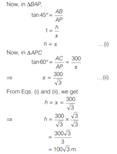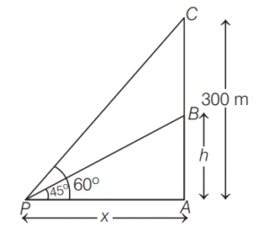 9. An aeroplane flying at a height of 300 m above the ground passes vertically above another plane at an instant when the angles of elevation of the two planes from the same point on the ground are 60º and 45º respectively. What is the height of the lower plane from the ground? [2017 (I) Morning Shift]
