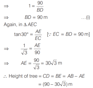 10. From the top of a building 90 m high, the angles of depression of the top and the bottom of a tree are 30º and 45º respectively. What is the height of the tree? [2017 (I) Morning Shift]