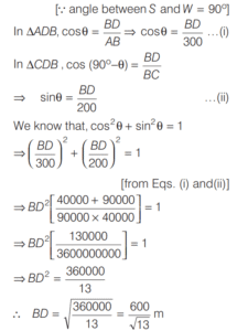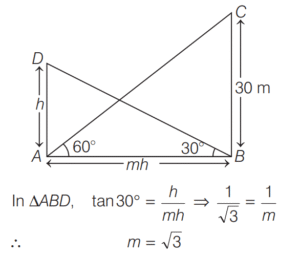 HEIGHT AND DISTANCE (CDS)Total Questions: 2421. If from the top of a post a string twice the length of the post is stretched tight to a point on the ground, then what angle will the string make with the post? [2014 (II) Evening Shift](a) π/6(b) π/4(c) 5π/12(d) π/3Correct Answer: (d) π/3Solution:Let AB be the height, AC be the string and the angle made by string with the post be θ. 22. From a certain point on a straight road a person observe a tower in the West direction at a distance of 200 m. He walks some distance along the road and finds that the same tower is 300 m South of him. What is the shortest distance of the tower from the road? [2014 (II) Evening Shift](a) 300/√13 m(b) 500/√3 m(c) 600/√13 m(d) 900/√3 mCorrect Answer: (c) 600/√13 mSolution:Let person be at pointC and observes a tower in West direction at B.23. The shadow of a tower standing on a level plane is found to be 50 m longer when the Sun’s elevation is 30°, then when it is 60°. What is the height of the tower? [2014 (I) Morning Shift ](a) 25 m(b) 25√3 m(c) 25√3 m(d) 30 mCorrect Answer: (b) 25√3 mSolution:Let h be the height of the tower and BC be x m.24. The angle of elevation of the top of a tower 30 m high from the foot of another tower in the same plane is 60° and the angle of elevation of the top of the second tower from the foot of the first tower is 30°. The distance between the two towers is m times the height of the shorter tower. What is m equal to? [2014 (I) Morning Shift ](a) √2(b) √3(c) 1/2(d) 1/3Correct Answer: (b) √3Solution:Let h be the height of shorter tower, then the distance between the two towers is mh m.Submit Quiz« Previous123