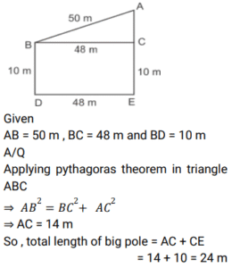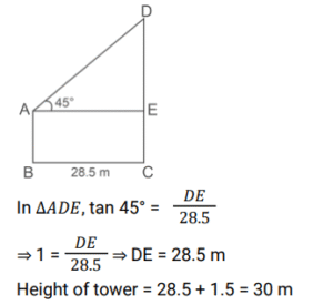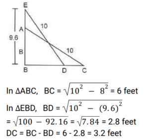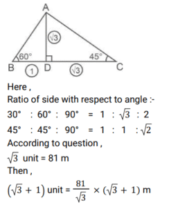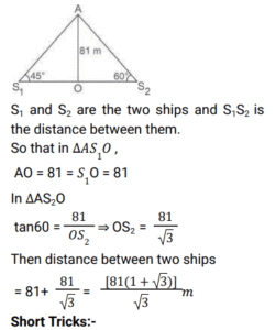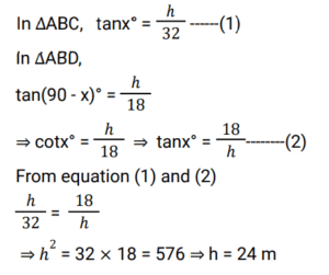 Height and Distance (Railway Maths)Total Questions: 5721. The angles of elevation of the top of a tower from two points on the ground 18 m and 32 m away from the foot of the tower are complementary. The height of the tower is. [RRB NTPC 09/01/2021 (Evening)](a) 20 m(b) 36 m(c) 24 m(d) 32 mCorrect Answer: (c) 24 mSolution:22. 5 m long ladder is leaning against a wall and it reaches the wall at a point 3 m high. By how much distance the ladder should be moved towards the wall so that its top reaches a point 4.8 m high? [RRB NTPC 10/01/2021 (Morning)](a) 1.4 m(b) 2.6 m(c) 2.96 m(d) 2.2 mCorrect Answer: (b) 2.6 mSolution:23. A window in a building is at a height of 10 m from the ground. The angle of depression at a point P on the ground from the window is 30°. The angle of elevation of the top of the building from the point P is 60°. What is the height of the building? [RRB NTPC 10/01/2021 (Evening)](a) 30 m(b) 40 m(c) 35 m(d) 20 mCorrect Answer: (a) 30 mSolution:24. A 10 feet long ladder leaning against a wall, reaches the wall at a point 8 feet high. By how much distance should the ladder be moved towards the wall so that its top reaches a point 9.6 feet high? [RRB NTPC 11/01/2021 (Evening)](a) 2.8 ft(b) 3.2 ft(c) 4.4 ft(d) 3.92 ftCorrect Answer: (b) 3.2 ftSolution:25. A tree, 12 m in height, is broken by the wind in such a way that its top touches the ground and makes an angle of 60° with the ground. At what height from the bottom is the tree broken by the wind? [RRB NTPC 10/01/2021 (Morning)](a) (24√2 - 30) m(b) (24√3 - 36)m(c) (2√3 - 3) m(d) 24√3 mCorrect Answer: (b) (24√3 - 36)mSolution:26. An observer 1.5 m tall is standing 28.5 m away at the same level as the foot of a tower. If the angle of elevation of the observer watching the top of the tower is 45 degrees, then what is the height of the tower? [RRB NTPC 16/01/2021 (Morning)](a) 30 m(b) 25 m(c) 35 m(d) 20 mCorrect Answer: (a) 30 mSolution:27. Two ships are sailing in the sea on the two sides of a lighthouse. The angles of elevation of the top of the lighthouse as observed from the ships are 45° and 60° respectively. If the lighthouse is 81 m high then the distance between the two ships is: [RRB NTPC 16/01/2021 (Evening) ](a)(b)(c)(d)Correct Answer: (c)Solution:28. The angle of elevation of the sun when the length of the shadow of a pole is equal to its height is. [RRB NTPC 17/01/2021 (Evening)](a) 30°(b) 60°(c) 90°(d) 45°Correct Answer: (d) 45°Solution:29. Two poles are standing on the ground. The distances between their feet and their tops are 48m and 50m respectively. If the height of the small pole is 10m, find the height of the big pole. [RRB NTPC 25/01/2021 (Morning)](a) 12m(b) 14m(c) 16m(d) 24mCorrect Answer: (d) 24mSolution:30. The top of a tower makes complementary angles of elevation from two points at the distances of 25m and 16m from its foot on the ground. Find the height of the tower. [RRB NTPC 25/01/2021 (Morning)](a) 25m(b) 18m(c) 20m(d) 17mCorrect Answer: (c) 20mSolution:Submit Quiz« Previous123456Next »
