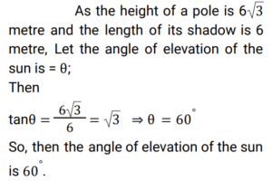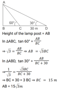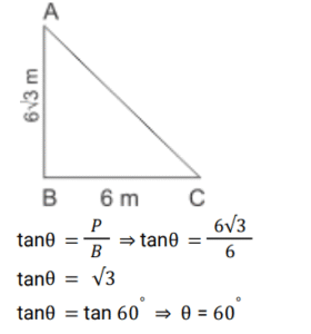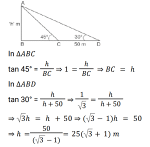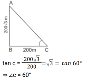 Height and Distance (Railway Maths)Total Questions: 5731. An electric pole casts a shadow of length 28m at a time when a nearby tree 8m high casts a shadow of length 14m. Find the height of the pole. [RRB NTPC 27/01/2021 (Evening)](a) 16 m(b) 14m(c) 20m(d) 15mCorrect Answer: (a) 16 mSolution:32. The angles of depression of two houses of the same height from the top of a building are 45° and 30° towards the east. If the two houses are 50 m apart, what will be the height of the building in meters? [RRB NTPC 29/01/2021 (Morning)](a) 50 (√3 + 1)(b) 25 (√3 + 1)(c) 45 (√3 - 1)(d) 35 (√3 - 1)Correct Answer: (b) 25 (√3 + 1)Solution:33. A kite is flying with a thread of length 296 m, making an angle of elevation measuring 30° at a point of the hand of a person of height 2m from the ground. Find the height of the kite from the ground. [RRB NTPC 30/01/2021 (Morning)](a) 250 m(b) 150 m(c) 200 m(d) 300 mCorrect Answer: (b) 150 mSolution:34. From a point Y on the level ground, the angle of elevation of the top of a lamp post is 45°. If the distance of point Y from the foot of the lamp post is 80 m, the height of the lamp post will be: [RRB NTPC 31/01/2021 (Evening)](a) 70 m(b) 80 m(c) 82 m(d) 78 mCorrect Answer: (b) 80 mSolution:35. The angle of elevation of a lamp post changes from 30° to 60° when a person walks 30 m towards it. Find the height of the lamp post. [RRB NTPC 01/02/2021 (Evening)](a) √3 m(b) 5√3 m(c) 15√3 m(d) 3√3 mCorrect Answer: (c) 15√3 mSolution:36. Find the angle of elevation of a 200√3 m tower’s top from a point 200 m away from its base. [RRB NTPC 03/02/2021 (Evening)](a) 90°(b) 45°(c) 30°(d) 60°Correct Answer: (d) 60°Solution:37. An observer 1.5 m tall is 24.5 m away from a 26 m high tower. The angle of elevation of the top of the tower from the eye of the observer is: [RRB NTPC 03/03/2021 (Evening)](a) 60°(b) 30°(c) 45°(d) 75°Correct Answer: (c) 45°Solution:38. If the height of a pole is 6√3 metre and the length of its shadow is 6 metre, then the angle of elevation of the sun is: [RRB NTPC 07/03/2021 (Evening)](a) 60°(b) 45°(c) 30°(d) 0°Correct Answer: (a) 60°Solution:39. A pole consists of a steel portion, and a wooden portion on top of the steel portion. Point A on the ground, is 100 m away from the base of the pole. The angle of elevation from point A to the top S of the wooden portion of the pole, is 60°. The angle of elevation, from A to the top R of the steel portion of the pole, is 45°. What is the height of the wooden portion of the pole? (Take √3 = 1.732) [RRB NTPC 11/03/2021 (Evening) ](a) 98.2 m(b) 141.2 m(c) 73.2 m(d) 114.2 mCorrect Answer: (c) 73.2 mSolution:40. If the length of a pole is 6√3 m and the length of the shadow is 6 m, then the angle of elevation of the sun is: [RRB NTPC 13/03/2021 (Evening)](a) 0°(b) 60°(c) 30°(d) 45°Correct Answer: (b) 60°Solution:Submit Quiz« Previous123456Next »
