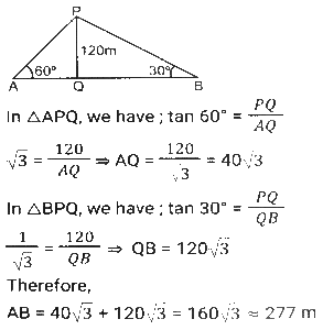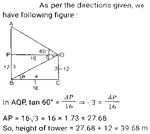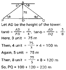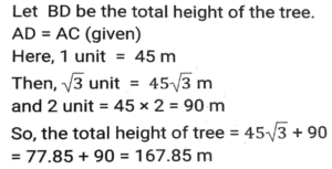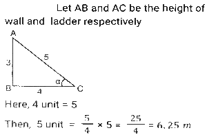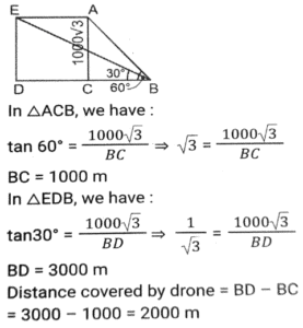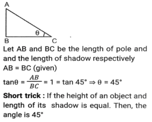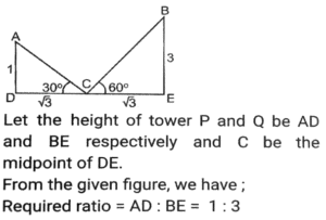 Height and DistanceTotal Questions: 4511. From a point exactly midway between the foot of two towers P and Q, the angles of elevation of their tops are 30 and 60 respectively. The ratio of the height of P to that of Q is: [SSC CGL Tier II (12/09/2019)](a) 1 : 3(b) 1 : 2(c) 1 : 2√3(d) 2 : 3√3Correct Answer: (a) 1 : 3Solution:12. The angle of elevation of a flying drone from a point on the ground is 60°. After flying for 5 seconds the angle of elevation drops to 30°. If the drone is flying horizontally at a constant height of 1000√3 m the distance (in m) travelled by the drone is: [SSC CPO 16/03/2019 (Afternoon)](a) 2000(b) 1000(c) 3000(d) 4000Correct Answer: (a) 2000Solution:13. At a certain time of a day a tree 5.4 m height casts a shadow of 9 m. If a pole casts a shadow of 13.5 m at the same time, the height of the pole is: [SSC CPO 16/03/2019 (Morning)](a) 8.1 m(b) 9.9 m(c) 7.2 m(d) 6.3 mCorrect Answer: (a) 8.1 mSolution:14. What is the angle of elevation of the sun from the top of a pillar, when its height is equal to the length of its shadow? [SSC CPO 15/03/2019 (Evening)](a) 30°(b) 90°(c) 45°(d) 60°Correct Answer: (c) 45°Solution:15. The top of a broken tree touches the ground at a 60° angle, 45 meters away from the root of the tree. What will be the total height (in m) of the tree? [SSC CPO 14/03/2019 (Evening)](Use √3 = 1.73 and √2 = 1.41)(a) 153.45(b) 141.3(c) 167.85(d) 137.24Correct Answer: (c) 167.85Solution:16. From the top of the 120 m high lighthouse, the angle of depression of two ships on opposite sides of the base of the lighthouse is 30° and 60°. What is the distance between the ships? (rounded off) [SSC CPO 14/03/2019 (Morning)](a) 327 m(b) 127 m(c) 277 m(d) 177 mCorrect Answer: (c) 277 mSolution:17. From the top of 75 m high tower, the angle of depression of two points P and Q on opposite side of the base of the tower on level ground is θ and Φ, such that tanθ = 3/4 and tanΦ = 5/8. What is the distance (in m) between the points P and Q? [SSC CPO 13/03/2019 (Morning)](a) 190(b) 200(c) 180(d) 220Correct Answer: (d) 220Solution:18. From the top of a 12 m high building, the angle of elevation of the top of the tower is 60° and the angle of depression of the foot of the tower is θ, such that tanθ = 3/4. what is the height of the tower ? (√3 = 1.73) [SSC CPO 12/03/2019 (Evening)](a) 41.41(b) 36.22(c) 39.68(d) 37.95Correct Answer: (c) 39.68Solution:19. A ladder leaning against a wall makes an angle alpha with the horizontal ground such that tan α = 3/4. If the foot of the ladder is 5m away from the wall, what is the length (in m) of the ladder ? [SSC CPO 12/03/2019 (Morning)](a) 5.25(b) 3.75(c) 6.25(d) 4.5Correct Answer: (c) 6.25Solution:20. A pole 10 m long rests slantly against a vertical wall AB making an angle 30° with the horizontal (ground). Find how far the foot of the pole is from the wall (in metres) [SSCC CGL 10/09/2024 (1st Shift)](a) 15(b) 5/√3(c) 10(d) 5√3Correct Answer: (d) 5√3Solution:Submit Quiz« Previous12345Next »