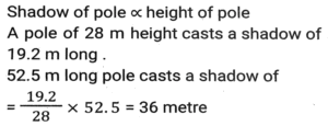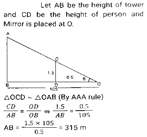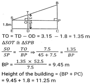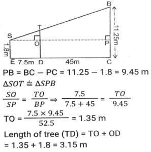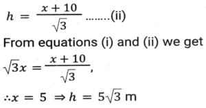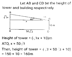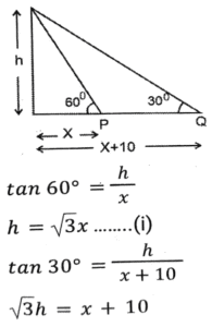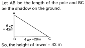 Height and DistanceTotal Questions: 4521. A mirror is placed on the ground facing upwards. A man sees the top of a tower in the mirror which is at a distance of 105 m from the mirror. The man is 0.5 m away from the mirror, and his height is 1.5 m. Find the height of the tower (in metres). [SSC CHSL 10/07/2024 (1st Shift)](a) 280(b) 115(c) 315(d) 210Correct Answer: (c) 315Solution:22. A vertical pole of length 6 m casts a 4 m long shadow on the ground. At the same time, a tower casts a 28 m long shadow. Find the height of the tower. [SSC CHSL 11/07/2024 (2nd Shift)](a) 48 m(b) 32 m(c) 36 m(d) 42 mCorrect Answer: (d) 42 mSolution:23. A pole stands vertically on the ground with the help of a 12-metre steel wire tied to its top and affixed on the ground. If the steel wire makes an angle of 30° with the horizontal ground, then the height of the pole is equal to: [SSC CHSL Tier II 02/11/2023](a) 8 meters(b) 6√3 meters(c) 8√3 meters(d) 6 metersCorrect Answer: (d) 6 metersSolution:24. A man observed the top of an electric pole at angles of elevation of 60° and 30°, respectively, from two different observation points P and Q If the distance between P and Q is 10 m, find the height of the pole (in m). [SSC CHSL Tier II 10/01/2024](a) 5√3(b) 5(c) 15(d) 15√3Correct Answer: (a) 5√3Solution: 25. From the top of a tower, the angle of depression of the top of a 10 m high building is 60°. If the distance between the tower and the building is 50√3 m, find the height of the tower. [SSC CGL Tier II (26/10/2023)](a) 150 m(b) 100 m(c) 160 m(d) 140 mCorrect Answer: (c) 160 mSolution:26. A vertical pillar 42 cm long casts a 35 cm long shadow. At the same time, a tower casts a shadow 25 m long. Find the height of the tower. [SSC CHSL 07/08/2023 (4th Shift)](a) 28 m(b) 35 m(c) 32 m(d) 30 mCorrect Answer: (d) 30 mSolution:27. Suhas, a 3.15 m tall tree, and a building are positioned such that their feet on the ground are collinear and the tree is located between Suhas and the building. The tree is located at a distance of 7.5 m from Suhas and at a distance of 45 m from the building. Further, the eyes of Suhas, the top of the tree, and the top of the building fall in one line, and the eyes of Suhas are at a height of 1.8 m from the ground. Find the height (in m) of the building. [SSC CHSL 14/08/2023 (2nd Shift)](a) 11.25(b) 11.50(c) 10.25(d) 10.75Correct Answer: (a) 11.25Solution:28. Suhas, a tree, and an 11.25 m tall building are positioned such that their feet on the ground are collinear and the tree is located between Suhas and the building. The tree is located at a distance of 7.5 m from Suhas and at a distance of 45 m from the building. Further, the eyes of Suhas, the top of the tree, and the top of the building fall in one line, and the eyes of Suhas are at a height of 1.8 m from the ground. Find the height (in m) of the tree. [SSC CHSL 17/08/2023 (2nd Shift)](a) 3.00(b) 3.30(c) 3.15(d) 3.45Correct Answer: (c) 3.15Solution:29. A person standing at a distance looks at a building having a height of 1000 metres. The angle between the top of the building and the ground is 30°. At what approximate distance (in metres) is the person standing away from the building. [SSC CGL 17/07/2023 (4th shift)](a) 1000(b) 936(c) 1732(d) 1542Correct Answer: (c) 1732Solution: 30. A vertical pole of 28m height casts a 19.2m long shadow. At the same time, find the length of the shadow cast by another pole of 52.5m height. [SSC CGL 20/07/2023 (4th shift)](a) 36 m(b) 35 m(c) 40m(d) 30 mCorrect Answer: (a) 36 mSolution:Submit Quiz« Previous12345Next »