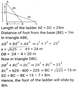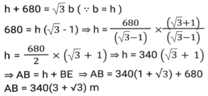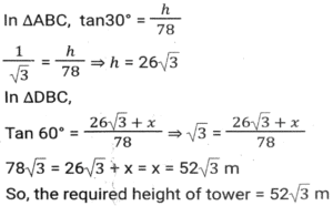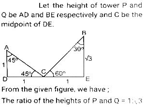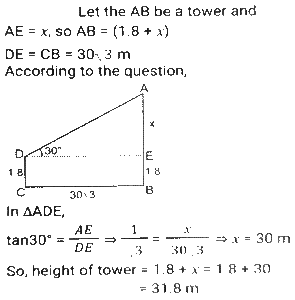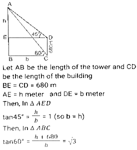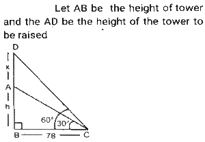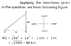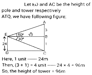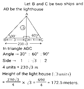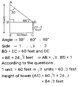 Height and DistanceTotal Questions: 4531. Two ships are on the opposite side of a lighthouse such that all three of them are collinear. The angles of depression of the two ships from the top of the lighthouse are 30° and 60°. If the ships are 230√3 m apart, then find the height of the light house (in m). [SSC CGL Tier II (02/03/2023)](a) 175.4(b) 165.2(c) 172.5(d) 180.5Correct Answer: (c) 172.5Solution:32. From the top of an upright pole 24√3 feet high, the angle of elevation of the top of an upright tower was 60°. If the foot of the pole was 60 feet away from the foot of the tower, what tall (in feet) was the tower? [SSC CGL Tier II (06/03/2023)](a) 84√3(b) 36√3(c) 44√3(d) 60√3Correct Answer: (a) 84√3Solution:33. The angle of elevation of the top of a tower from the top of a building whose height is 680 m is 45° and the angle of elevation of the top of the same tower from the foot of the same building is 60°. What is the height (in m) of the tower? [ SSC CGL Tier II (07/03/2023)](a) 340(3 + √3)(b) 310(3 - √3)(c) 310(3 + √3)(d) 340(3 - √3)Correct Answer: (a) 340(3 + √3)Solution: 34. An airplane goes 14 km due east and then 48 km due north. How far is it from its initial position? [SSC CGL 13/12/2022 (3rd Shift)](a) 14 km(b) 48 km(c) 50 km(d) 28 kmCorrect Answer: (c) 50 kmSolution:35. A person 1.8 metre tall is 30√3 metres away from a tower. If the angle of elevation from his eye to the top of the tower is 30 degree, then what is the height (in m) of the tower? [SSC CGL Tier II (08/08/2022)](a) 32.5(b) 37.8(c) 30.5(d) 31.8Correct Answer: (d) 31.8Solution:36. The foot of a ladder 25 m long is 7 m from the base of the building. If the top of the ladder slips by 4 m, then by how much distance will the foot of the ladder slide? [SSC CHSL 24/05/2022 (Morning)](a) 9 m(b) 7m(c) 6m(d) 8 mCorrect Answer: (d) 8 mSolution:37. The angle of elevation of the top of an unfinished tower at a point distant 78 m from its base is 30°. How much higher must the tower be raised (in m) so that the angle of elevation of the top of the finished tower at the same point will be 60°? [SSC CGL 11/04/2022 (Morning)](a) 78/3(b) 80(c) 52/3(d) 26/3Correct Answer: (c) 52/3Solution: 38. A vertical pole and a vertical tower are on the same level ground in such a way that, from the top of pole, the angle of elevation of the top of the tower is 60° and the angle of depression of the bottom of the tower is 30°. If the height of the pole is 24 m, then find the height of the tower (in m). [SSC CGL 12/04/2022 (Morning)](a) 24√3(√3 + 1)(b) 72(c) 96(d) 24(√3 + 1)Correct Answer: (c) 96Solution:39. The angle of elevation of the top of a tall building from the points M and N at the distances of 72m and 128m, respectively, from the base of the building and in the same straight line with it, are complementary. The height of the building (in m) is? [SSC CGL 12/04/2022 (Afternoon)](a) 84(b) 96(c) 80(d) 90Correct Answer: (b) 96Solution:40. Exactly midway between the foot of two towers P and Q, the angle of elevation of their tops are 45° and 60°, respectively. The ratio of the heights of P and Q is: [SSC CGL 18/04/2022 (Morning)](a) 1 : √3(b) 3 : 1(c) 1 : 3(d) √3 : 1Correct Answer: (a) 1 : √3Solution:Submit Quiz« Previous12345Next »