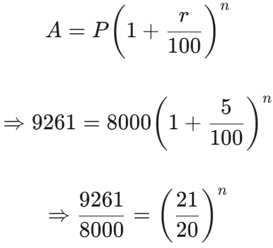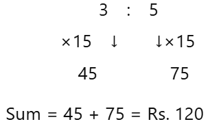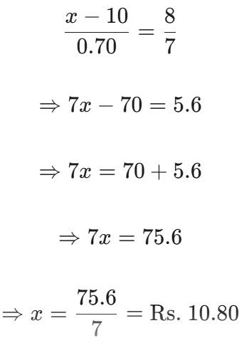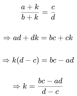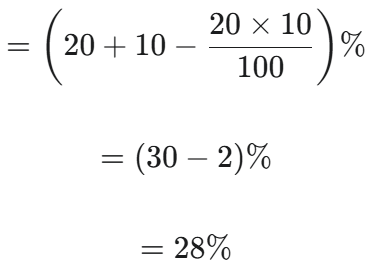 HSSC CET Group-D Exam 22.10.2023 (Shift-I)Total Questions: 10041. The single discount equivalent to two successive discounts of 20% and 10% is :(1) 25% (2) 28%(3) 27%(4) 30%(5) Not attemptedCorrect Answer: (2) 28%Solution:Single equivalent discount of two successive discounts of 20% and 10% 42. The average of four consecutive numbers A B, C and D is 49.5. What is the product of B and D ?(1) 2450 (1) 2450 (3) 2550 (4) 2499(5) Not attemptedCorrect Answer: (4) 2499Solution:Average of four consecutive numbers A, B, C & D = 49.5 Product of B and D= 49 × 51 = 249943. In how many years will a sum of Rs. 8000 at 5% per annum compound interest, compounded; annually becomes Rs. 9261?(1) 3(2) 4⅔(3) 5(4) 3⅓(5) Not attemptedCorrect Answer: (1) 3Solution:Required time = 3 years44. The smallest 5-digit number which is exactly divisible by 12, 15 and 18 is :(1) 10,015(2) 10,020(3) 10,080(4) 10,010(5) Not attemptedCorrect Answer: (3) 10,080Solution:LCM of 12, 15 & 18 = 180Smallest 5-digit number Required number= 10000 + 180 - 100= 1008045. The HCF of 2² × 3³ × 5⁵, 2³ × 3² × 5² × 7 and 2⁴ × 3⁴ × 5 × 7² × 11 is(1) 2² × 3⁴ × 5 × 7² × 11(2) 2² × 3⁴ × 5⁵(3) 2⁴ × 3⁴ × 5⁵ × 7 × 11(4) 2² × 3² × 5(5) Not attemptedCorrect Answer: (5) Not attemptedSolution:2³ × 3³ × 5⁵ 2³ × 3² × 5² × 7 2⁴ × 3⁴ × 5 × 7² × 11 HCF = 2³ × 3² × 546. Wheat at Rs. 9.30 per kg is mixed with another quality of wheat in the ratio 8:7. If the mixture so formed be worth Rs. 10 per kg, what is the rate per kg of the second quality of wheat?(1) Rs. 10.60(2) Rs. 10.80(3) Rs. 11.00(4) Rs. 10.30(5) Not attemptedCorrect Answer: (2) Rs. 10.80Solution:Let price of second type of wheat per kg By rule of alligation 47. The number that must be added to each term of a : b so as to get the ratio c : d, is :(1) (ac + bd) / (c + a)(2) (ad + bc) / (c + d)(3) (ab - cd) / (c - b)(4) (ab - cd) / (a - b)(5) Not attemptedCorrect Answer: (3) (ab - cd) / (c - b)Solution:Let number to be added According to question, 48. A certain sum is divided in the ratio 3 : 5. If the greater part is Rs. 75, then the sum is :(1) Rs. 130(2) Rs. 150(3) Rs. 240(4) Rs. 120(5) Not attemptedCorrect Answer: (4) Rs. 120Solution:49. If 0 < x < 1, then the greatest number among the following is :(1) x² (2) 1/x(3) 1/x²(4) x(5) Not attemptedCorrect Answer: (3) 1/x²Solution:0 < x < 1from options, largest number 50. A can complete 1/3 of a work in 5 days and B can complete 2/5 of the same work in 10 days. In how many days both A and B together can complete the work?(1) 8⅘(2) 9⅜(3) 10 (4) 7½(5) Not attemptedCorrect Answer: (2) 9⅜Solution: Time taken by A = 3 × 5 = 15 days Time taken by B = 5/2 × 10 = 25 days Time taken by (A + B) to complete the work Submit Quiz« Previous12345678910Next »