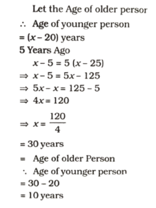 8. Age difference of 2 persons is 20 years. If 5 years ago older was 5 times older than the younger then calculate present age of both in years.