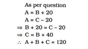 7. 120 is divided in the A,B & C so the A's part is 20 Rs. more than B & 20 Rs. less then C, Evaluate the B's part.
