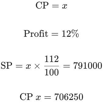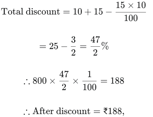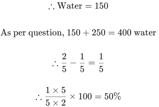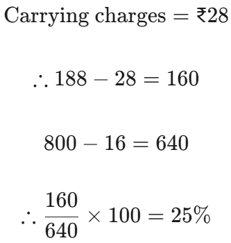 HSSC PGT Political Science Exam, 12.03.2016 Shift ITotal Questions: 8041. Who designed Rashtrapati Bhawan?(1) Edward stone(2) Le corbusier(3) Edwin Lutyens(4) None of theseCorrect Answer: (3) Edwin LutyensSolution:The President house was designed by Edwin Lutyens.42. The addition of the square of two positive number is 100 and difference of square is 28, what is the addition of numbers?(1) 12 (2) 13(3) 14(4) 15Correct Answer: (3) 14Solution: - + - 43. A seller gains 12% profit of cost price. If his sale in one month is ₹ 791000, what is his prof- it?(1) ₹ 91000(2) ₹ 97786(3) ₹ 85659(4) ₹ 88300(5) None of the aboveCorrect Answer: (5) None of the aboveSolution:44. A shopkeeper bought a chair with a written prize of ₹ 800 after two successive discount of 10% and 15%. He invests ₹ 28 in carrying it and sells in ₹ 800 afterwards. What is his profit percentage?(1) 40% (2) 30%(3) 25% (4) 14%Correct Answer: (3) 25% Solution:Two consecutive discount 10,15% 45. The smallest square number which is completely divisible by 14, 16 and 18 –(1) 6048(2) 7056(3) 1008 (4) 2046Correct Answer: (2) 7056Solution:LCM of 14, 16, 18 = 1008 To make it perfect square it has to be multiplied by one more 7. 7 × 1008 = 705646. The C.P. of 18 articles is equal to selling price of 15 articles. Find the profit percentage.(1) 15% (2) 20%(3) 25%(4) 18%Correct Answer: (2) 20%Solution:47. A man bought 5 pencils for one rupee and sold them at 3 for 1 rupee. Find his profit percent- age.(1) 66% (2) 76%(3) 56%(4) 46%Correct Answer: (1) 66% Solution:Bought 5 pencil @₹1 Sold 3 pencils @₹1 Profit of 2 pencil 48. The product of the L.C.M and H.C.F of two numbers is 24 difference of two numbers is 2. Find the numbers–(1) 8 and 6 (2) 8 and 10(3) 2 and 4(4) 6 and 4Correct Answer: (4) 6 and 4Solution:LCM × HCF = a.b given, LCM × HCF = 24 a - b = 2 ∴ from options 6 × 4 = 24 6 - 4 = 2∴ a = 6 , b = 449. An amount of one lakh is in- vested in two types of shares. The first yields an interest of 9% per annum and the second 11% per annum. If the total interest after one year is 9750, the amount invested in each share was :(1) ₹ 72500, ₹ 27500(2) ₹ 62500, ₹ 37500(3) ₹ 52500, ₹ 47500(4) ₹ 82500, ₹ 17500Correct Answer: (2) ₹ 62500, ₹ 37500Solution:50. From a mixture of milk and water in the ratio 2 : 3, 50% mixute is taken away and added with the same quantity of water. Find the reduced concentration of the mixture.(1) 25%(2) 33.33%(3) 50%(4) 75%Correct Answer: (3) 50%Solution:Milk : Water 2 : 3200 : 300 --- (200 + 300 = 500)As per question 250 × 2/5 250 × 3/5100 : 150Submit Quiz« Previous12345678Next »