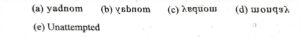 HSSC Work Supervisor (14-01-2024)Total Questions: 10041. d ?(a) d(b) d(a) d(a) d(e) UnattemptedCorrect Answer: (b) d42. What are the different materials used for manufacturing bricks according to British Standards?(a) Only fired clay(b) Fired clay and concrete(c) Fired clay and calcium silicate(d) Fired clay, calcium silicate and concrete(e) UnattemptedCorrect Answer: (d) Fired clay, calcium silicate and concrete43. Purpose of providing ............ is to divide the total length of bridge onto suitable spans with minimum obstruction to the stream of river.(a) Abutments(b) Piers(c) Pile bents(d) Approach(e) UnattemptedCorrect Answer: (b) Piers44. At least ............ windows on the opposite walls serve effective ventilation.(a) Two(b) Three(c) Four(d) Five(e) UnattemptedCorrect Answer: (a) Two45. To enable free movement of traffic around an urban area, a circumferential road is constructed which is called ?(a) Loop roads(b) Ring road(c) By-pass road(d) Trunk road(e) UnattemptedCorrect Answer: (b) Ring road46. What is paint ?(a) A mixture of water and oil(b) A dispersion of pigment in drying oil(c) A type of wood varnish(d) A solution of salt in water(e) UnattemptedCorrect Answer: (b) A dispersion of pigment in drying oil47. ............ technique permits the direct reading of any printed character without any special ink.(a) Magnetic-Ink Character Recognition (MICR)(b) Optical Character Recognition (OCR)(c) Optical Mark Recognition (OMR)(d) Mouse/keyboard Capture Recorder (MCR)(e) UnattemptedCorrect Answer: (b) Optical Character Recognition (OCR)48. Mercury cell suitable for low current devices like hearing aids, watches etc., consists of ............ as anode.(a) Silver-mercury amalgam(b) Lead-mercury amalgam(c) Pt-mercury amalgam(d) Zinc-mercury amalgam(e) UnattemptedCorrect Answer: (d) Zinc-mercury amalgam49. Choose the option which most closely resembles water image of the given word.monday(a)(b)(c)(d)(e) UnattemptedCorrect Answer: (d)50. Maximum permissible F. A. R. for Industrial building is :(a) 1.2(b) 2(c) 0.7(d) 2.5(e) UnattemptedCorrect Answer: (a) 1.2Submit Quiz« Previous12345678910Next »