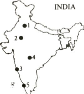 Solution:Central Marine Fisheries Research Institute is located in Cochin of Kerala, which is marked as "5" in the given map. Central sheep breeding farm is located in Hissar of Haryana, which is marked as '2'. National Dairy Research Institute is situated in Karnal of Haryana is marked by '1' in the map. National Institute of Agricultural Extension is situated at Hyderabad of Andhra Pradesh and is marked by '4' in the given map.