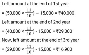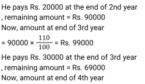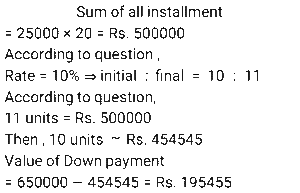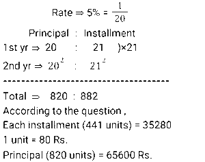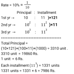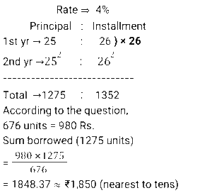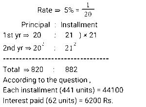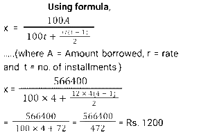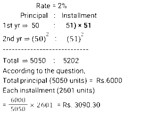 Installment (SSC)Total Questions: 4031. A sum of Rs.6,000 is to be paid back in two equal annual installments; each installment is to be paid at the end of every year. How much is each installment if the interest is compounded annually at 2% p.a.? (Rounded off up to two decimal places) [SSC CGL 02/12/2022 (1st Shift)](a) Rs.2,092.29(b) Rs.3,090.30(c) Rs.2,291.29(d) Rs.3,589.30Correct Answer: (b) Rs.3,090.30Solution:32. What annual installment will discharge a debit of ₹5,664 in 4 years at 12% simple interest ? [SSC CGL 02/12/2022 (3rd Shift)](a) ₹1,230(b) ₹1,210(c) ₹1,200(d) ₹1,220Correct Answer: (c) ₹1,200Solution:33. A car with a price of ₹6,50,000 is bought by making some down payment. On the balance, a simple interest of 10% is charged in lump sum and the money is to be paid in 20 equal annual installments of ₹25,000. How much is the down payment? [SSC CGL 06/12/2022 (2nd Shift)](a) ₹ 1,55,945(b) ₹ 1,95,455(c) ₹ 1,94,555(d) ₹ 1,45,955Correct Answer: (b) ₹ 1,95,455Solution:34. A person borrows Rs.1,00,000 from a bank at 10% per annum simple interest and clears the debt in five years. If the installment paid at the end of the first, second, third and fourth years to clear the debt are Rs.10,000, Rs.20,000, Rs.30,000 and Rs.40,000, respectively, what amount should be paid at the end of the fifth year to clear the debt? [SSC CGL 12/12/2022 (1st Shift)](a) Rs.38,250(b) Rs.39,490(c) Rs.40,450(d) Rs.36,450Correct Answer: (a) Rs.38,250Solution:35. A man borrowed Rs.50,000 from a bank at 10% per annum, compounded annually. At the end of every year, he pays Rs.15,000 as part payment of the loan and interest. How much does he still owe to the bank after three such installments ? [SSC CPO 10/11/2022 (Morning)](a) Rs.16,900(b) Rs.15,800(c) Rs.15,200(d) Rs. 16,200Correct Answer: (a) Rs.16,900Solution:36. A sum of money was borrowed and paid back in two equal annual instalments of Rs. 980, allowing 4% compound interest. The sum (in Rs. to the nearest tens) borrowed was: [SSC CGL 11/04/2022 (Evening)](a) 1,850(b) 1,960(c) 1,760(d) 2,050Correct Answer: (a) 1,850Solution:37. A mobile phone is available for Rs. 79860 by cash payment or by paying cash of Rs. 60000 as down payment and the remaining amount in three equal annual installments. If the shopkeeper charges interest at the rate of 10% per annum compounded annually, then the amount of each installment (in Rs.) will be: [SSC CHSL 16/04/2021 (Afternoon)](a) 7986(b) 6789(c) 6689(d) 6000Correct Answer: (a) 7986Solution:38. A loan has to be returned in two equal yearly installments each of Rs 44,100. If the rate of interest is 5% p.a., compounded annually, then the total interest paid is: [SSC CGL Tier II (12/09/2019)](a) ₹5840(b) ₹6000(c) ₹6200(d) ₹6280Correct Answer: (c) ₹6200Solution:39. A certain loan was returned in two equal half yearly installments each of Rs 6,760. If the rate of interest was 8% p.a., compounded yearly, how much was the interest paid on the loan? [SSC CGL Tier II (13/09/2019)](a) ₹750(b) ₹810(c) ₹790(d) ₹770Correct Answer: (d) ₹770Solution:40. A sum of Rs x was borrowed and paid back in two equal yearly installments, each of Rs 35,280. If the rate of interest was 5%, compounded annually, then the value of x is: [SSC CGL 07/06/2019 (Afternoon)](a) 64,400(b) 65,600(c) 64,800(d) 65,400Correct Answer: (b) 65,600Solution:Submit Quiz« Previous1234