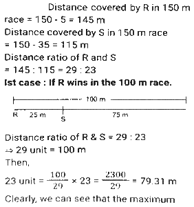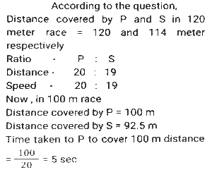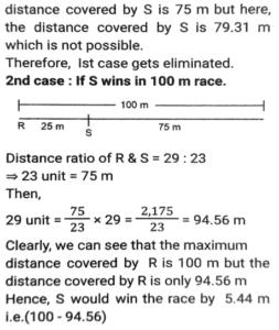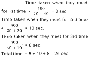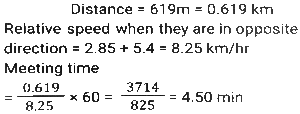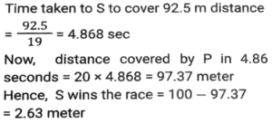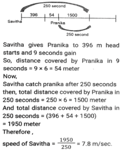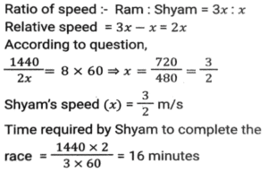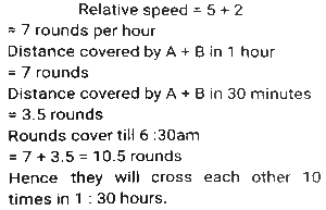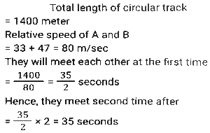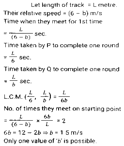 Linear/Circular RaceTotal Questions: 671. M and N walk along a circular track. They start at 5:00 a.m. from the same point in the opposite directions. M and N walk at a speed of 5 rounds per hour and 2 rounds per hour, respectively. How many times will they cross each other before 6.30 a.m. on the same day? [SSC CGL 12/09/2024 (1st Shift)](a) 10(b) 3(c) 5(d) 7Correct Answer: (a) 10Solution:2. In a circular path of 619 m, Preeti and Rani start walking in opposite directions from the same point at the speed of 2.85 km/h and 5.4 km/h, respectively. When will they meet for the first time approximately? [Matriculation Level 20/06/2024 (Shift-1)](a) After 4.75 minutes(b) After 6.05 minutes(c) After 4.50 minutes(d) After 6.75 minutesCorrect Answer: (c) After 4.50 minutesSolution:3. Two friends P and Q simultaneously start running from the same point around a circular track. They run in the same direction. P runs at 6 m/sec and Q runs at b m/sec. If they cross each other at exactly two points on the circular track and b is a natural number less than 6, then how many values can b take? [SSC CGL 14/07/2023 (3rd shift)](a) 2(b) 1(c) 4(d) 3Correct Answer: (b) 1Solution:4. In a 150-m race, if R gets a 5-metre head start, then he would beat S by 35 metres. If S gets a 25-metre head start in a 100-metre race, then______ would win the race by_______metres. [Graduate Level 20/06/2024 (Shift-3)](a) S; 4.44(b) R; 4.44(c) R; 5.44(d) S; 5.44Correct Answer: (d) S; 5.44Solution:5. Ram and Shyam are racing along a circular track. The speed of Ram is thrice the speed of Shyam. The length of the circular track is 1440 m. After the start of the race from the same point simultaneously, Ram meets Shyam for the first time at the end of the 8th minute. If Ram and Shyam start the race again from the same starting point simultaneously, then the time taken by Shyam to finish the race is: (given that the length of the race is same as the length of the track) [SSC CGL 26/07/2023 (2nd shift)](a) 7.5 min(b) 16 min(c) 30 min(d) 22.5 minCorrect Answer: (b) 16 minSolution:6. In a race, there are 4 members in a team. Each member has to cover 5 km one after another. If the total time taken is 30 minutes, then what would have been the average speed? [SSC CGL 06/12/2022 (4th Shift)](a) 50 km/hr(b) 40 km/hr(c) 50 m/sec(d) 40 m/secCorrect Answer: (b) 40 km/hrSolution:7. A and B are running on a circular track of length 1400 metres. The speed of A is 33 m/sec and the speed of B is 47 m/sec. They start from the same point at the same time in the opposite direction. After how much time will they meet for the second time? [SSC CHSL 17/08/2023 (2nd Shift)](a) 33 sec(b) 38 sec(c) 35 sec(d) 32 secCorrect Answer: (c) 35 secSolution:8. In a 120 metre race, P beats S by 6 metres. If S starts with a head start of 7.5 metres and it is a 100 metre race, then who wins the race and how many metres? (Correct to 2 decimal places) [SSC CHSL 14/08/2023 (3rd Shift)](a) S, 2.63(b) P, 3.63(c) S, 3.63(d) P, 2.63Correct Answer: (a) S, 2.63Solution:9. Savitha and Pranika decided to run a 2250 m long race on a track as long as the length of the race. But Savitha gave Pranika a 396 m head start and also allowed her to start 9 seconds before Savitha started running. Pranika ran at 6 m/per second and Savitha caught up with Pranika 250 seconds after Savitha started running. What was Savitha's speed (in m/s) during the race? [SSC CHSL 11/08/2023 (4th Shift)](a) 7.2(b) 7.8(c) 8(d) 7.5Correct Answer: (b) 7.8Solution:10. Two people A and B started running from the same point on a circular track of length 400 m in opposite directions with initial speeds of 10 m/s and 40 m/s, respectively. Whenever they meet, A's speed doubles and B's speed halves. After what time from the start will they meet for the third time? [SSC CHSL 09/08/2023 (4th Shift)](a) 30 sec(b) 24 sec(c) 26 sec(d) 28 secCorrect Answer: (c) 26 secSolution:Submit Quiz1234567Next »