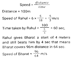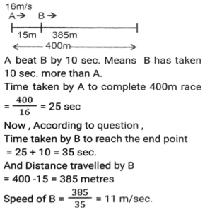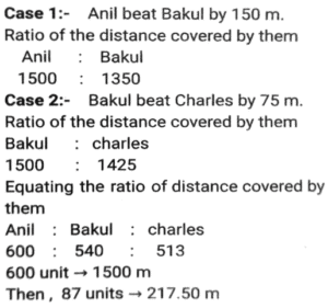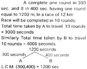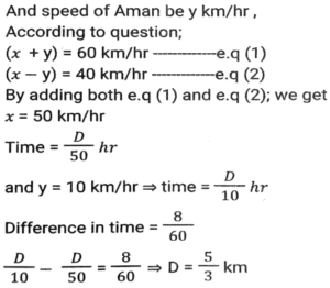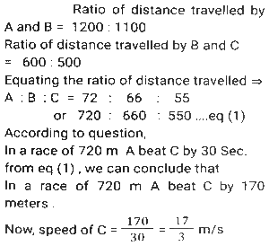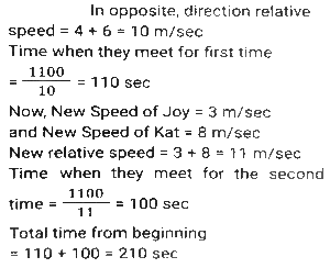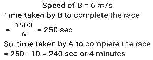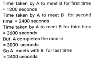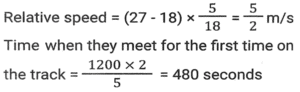 Linear/Circular RaceTotal Questions: 6751. In a 1200 m circular race, A and B start at the same time from the same position in the same direction at speeds of 18 km/h and 27 km/h, respectively. In how much time after the start of race will they meet for the first time on the track? [SSC CHSL Tier II (26/06/2023)](a) 300 seconds(b) 480 seconds(c) 520 seconds(d) 240 secondsCorrect Answer: (b) 480 secondsSolution:52. Farhan and Aman are going from Delhi to Haryana. The difference and sum of their speeds are 40 km/hour and 60 km/hour respectively. If in a race Farhan can finish 8 minutes earlier than Aman, then find the distance they both should cover. [SSC CHSL 21/03/2023 (1st Shift)](a) 5/3km(b) 8/3km(c) 3/5km(d) 3/8kmCorrect Answer: (a) 5/3kmSolution:Let speed of Farhan be x km/hr, 53. In a 1500 m race, Anil - beats Bakul by 150 m and in the same race Bakul beats Charles by 75 m. By what distance does Anil beat Charles? [SSC CGL 01/12/2022 (1st Shift)](a) 217.50 m(b) 200.15 m(c) 293.50 m(d) 313.75 mCorrect Answer: (a) 217.50 mSolution:54. In a 400 metre race, A runs at a speed of 16 m/sec. If A gives B a start of 15 metres and still beats him by 10 sec, then what is the speed of B? [SSC CGL 02/12/2022 (2nd Shift)](a) 11 m/sec(b) 10 m/sec(c) 13 m/sec(d) 9 m/secCorrect Answer: (a) 11 m/secSolution:55. In a 1200 m race, bike A beats bike B by 100 m. Bike B beats bike C by 100 m in a 600 m race. If bike A beats bike C by 30 sec in a 720 m race, then what is the speed of bike C ? [SSC CGL 03/12/2022 (4th Shift)](a) 17/3 m/sec(b) 26/9 m/sec(c) 17/9 m/sec(d) 26/3 m/secCorrect Answer: (a) 17/3 m/secSolution:56. Geeta runs 5/2 times as fast as Babita. In a race, if Geeta gives a lead of 40m to Babita, find the distance from the starting point where both of them will meet (correct up to two decimal places). [SSC CPO 10/11/2022 (Morning)](a) 66.67m(b) 65m(c) 65.33m(d) 66mCorrect Answer: (a) 66.67mSolution:Speed of Geeta = 5 m/sec Speed of Babita = 2 m/sec Relative speed of Geeta wrt Babita = 5-2 = 3 m/sec Time taken to cover 40m distance = 40/3 sec Now, the distance from the starting point where they meet = 5 × 40/3 = 200/3 = 66.67m57. A and B run a 12 km race on a circular track of length 1200 m. They complete one round in 300 seconds and 400 seconds, respectively. After how much time from start will the faster person meet the slower person for the last time? [SSC CPO 10/11/2022 (Evening)](a) 2400 seconds(b) 8400 seconds(c) 9600 seconds(d) 10800 secondsCorrect Answer: (a) 2400 secondsSolution:58. A gives B seconds in a 1500 m race and both finish the race at the same time. What is the time taken by A (in minutes) to finish the a head-start of 10 race if the speed of B is 6 m/s? [SSC CPO 11/11/2022 (Afternoon)](a) 3(b) 4(c) 8(d) 5Correct Answer: (b) 4Solution:59. Joy and Kat run around a circular track of length 1100 m in opposite directions with initial speed of 6 m/sec and 4 m/sec, respectively. Starting from the same point whenever they meet, Joy's speed halves and Kat's speed doubles. After how much time from the beginning will they meet for the second time? [Graduate Level 05/08/2022 (Shift - 3)](a) 190 sec(b) 210 sec(c) 220 sec(d) 200 secCorrect Answer: (b) 210 secSolution:60. Rahul runs at a speed of 6 km/h in a 100-metre race. Rahul gives Bharat a start of 4 metres and still beats him by 4 seconds. Find Bharat's speed. [Higher Secondary 01/08/2022 (Shift-3)](a) 4.5 km/h(b) 4.9 km/h(c) 5.4 km/h(d) 5.8 km/hCorrect Answer: (c) 5.4 km/hSolution:Submit Quiz« Previous1234567Next »