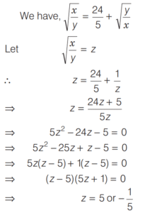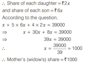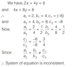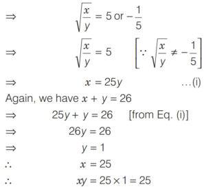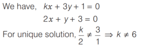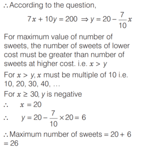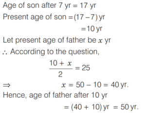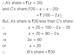 LINEAR EQUATIONS IN ONE AND TWO VARIABLES (CDS)Total Questions: 4111. ₹120 is distributed among A B, and C so that A’s share is ₹20 more than B’s and ₹20 less than C’s. What is B’s share? [2018 (I) Morning Shift](a) ₹10(b) ₹15(c) ₹20(d) ₹25Correct Answer: (c) ₹20Solution:Let B’s share be ₹x.12. At present the average of the ages of a father and a son is 25 year. After 7 year the son will be 17 year old. What will be the age of the father after 10 year? [2018 (I) Morning Shift](a) 44 year(b) 45 year(c) 50 year(d) 52 yearCorrect Answer: (c) 50 yearSolution:Given,13. A gentleman left a sum of ₹39,000 to be distributed after his death among his widow, five sons and four daughters. If each son receives 3 times as much as a daughter receives and each daughter receives twice as much as their mother receives, then what is the widow’s share? [2018 (I) Morning Shift](a) ₹1,000(b) ₹1,200(c) ₹1,500(d) None of theseCorrect Answer: (a) ₹1,000Solution:Let the share which mother receives be ₹x.14. Five years ago, Ram was three times as old as Shyam. Four years from now, Ram will be only twice as old as Shyam. What is the present age of Ram? [2017 (II) Evening Shift](a) 30 year(b) 32 year(c) 36 year(d) 40 yearCorrect Answer: (b) 32 yearSolution:Let the present age of Shyam be x yr and age of Ram be y yr. Then according to question,15. If 78 is divided into 3 parts which are proportional to 1, 1/3, 1/6, then the middle part is [2017 (II) Evening Shift](a) 28/3(b) 13(c) 52/3(d) 55/3Correct Answer: (c) 52/3Solution:16. Solve the following equation [2017 (I) Morning Shift](a) 5(b) 15(c) 25(d) 30Correct Answer: (c) 25Solution: 17. The pair of linear equations kx + 3y + 1 = 0 and 2x + y + 3 = 0 intersect each other, if [2017 (I) Morning Shift](a) k = 6(b) k ≠ 6(c) k = 0(d) k ≠ 0Correct Answer: (b) k ≠ 6Solution:For the system of linear equations18. Sunil wants to spend ₹200 on two types of sweets, costing ₹7 and ₹10 repectively. What is the maximum number of sweets he can get so that no money is left over? [2017 (I) Morning Shift](a) 25(b) 26(c) 27(d) 28Correct Answer: (b) 26Solution:Let the number of sweets purchased at the rate ₹7 and ₹10 be x and y respectively.19. The system of equations 2x + 4y = 6 and 4x + 8y = 8 is [2017 (I) Morning Shift](a) consistent with a unique solution(b) consistent with infinitely many solutions(c) inconsistent(d) None of the aboveCorrect Answer: (c) inconsistentSolution:20. Leela got married 6 yr ago. Today her age is 1¼ times her age at the time of her marriage. Her son's age is 1/10 age. What is the present age of her son? [2017 (I) Morning Shift](a) 1 year(b) 2 year(c) 3 year(d) 4 yearCorrect Answer: (c) 3 yearSolution:Let the age of Leela at her marriage was x year.Submit Quiz« Previous12345Next »