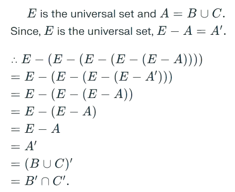 6. If E is the universal set and A = B ∪ C, then the set E − (E − (E − (E − (E − A)))) is same as the set?