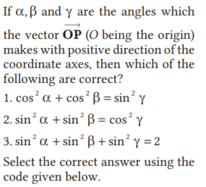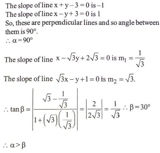 Mathematics NDA/NA SOLVED PAPER 2017 (II) (01 to 50)Total Questions: 5041. The points (a, b), (0, 0), (-a, -b) and (ab, b²) are:(a) the vertices of a parallelogram(b) the vertices of a rectangle(c) the vertices of a square(d) collinearCorrect Answer: (d) collinearSolution:42. The length of the normal from origin to the plane x + 2y - 2z = 9 is equal to?(a) 2 units(b) 3 units(c) 4 units(d) 5 unitsCorrect Answer: (b) 3 unitsSolution:43. Simplify the question?(a) 1 and 2 only(b) 2 and 3 only(c) 1 and 3 only(d) 1, 2 and 3Correct Answer: (c) 1 and 3 onlySolution:44. The angle between the lines x + y − 3 = 0 and x − y + 3 = 0 is α and the acute angle between the lines x − √3 y + 2√3 = 0 and √3 x − y + 1 = 0 is β. Which one of the following is correct?(a) α = β(b) α > β(c) α < β(d) α = 2βCorrect Answer: (b) α > βSolution:45. Simplify the question?(a) √3 units(b) 2 √3 units(c) √3/2 unit(d) 1/ √3 unitCorrect Answer: (b) 2 √3 unitsSolution:46. Simplify the question?(a)(b)(c)(d)Correct Answer: (a)Solution:47. Simplify the question?(a) 5 units(b) 7 units(c) 9 units(d) 10 unitsCorrect Answer: (c) 9 unitsSolution:48. Simplify the equation?(a)(b)(c)(d)Correct Answer: (b)Solution:49. A man running round a racecourse notes that the sum of the distances of two flag-posts from him is always 10 m and the distance between the flag-posts is 8 m. The area of the path he encloses is:(a) 18π square metres(b) 15π square metres(c) 12π square metres(d) 8π square metresCorrect Answer: (b) 15π square metresSolution:50. The distance of the point (1, 3) from the line 2x + 3y = 6, measured parallel to the line 4x + y = 4, is:(a) 5/√13 units(b) 3/√17 units(c) √17 units(d) √17/2 unitsCorrect Answer: (d) √17/2 unitsSolution:Submit Quiz« Previous12345