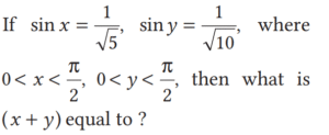 Mathematics NDA/NA SOLVED PAPER 2018 (I) (01 to 50)Total Questions: 5031. What is the sum of all two-digit numbers, which when divided by 3 leave 2 as the remainder?(a) 1565(b) 1585(c) 1635(d) 1655Correct Answer: (c) 1635Solution:32. If 0 > a > 1, the value of log₁₀ a is negative. This is justified by:(a) Negative power of 10 is less than 1(b) Negative power of 10 is between 0 and 1(c) Negative power of 10 is positive(d) Negative power of 10 is negativeCorrect Answer: (b) Negative power of 10 is between 0 and 1Solution:33. The third term of a GP is 3. What is the product of the first five terms?(a) 216(b) 226(c) 243(d) Cannot be determined due to insufficient dataCorrect Answer: (c) 243Solution:34. If x, 3/2, z are in AP; x, 3, z are in GP; then which one of the following will be in HP?(a) x, 6, z(b) x, 4, z(c) x, 2, z(d) x, 1, zCorrect Answer: (a) x, 6, zSolution:35. Answer the following question?(a) i(b) 2i(c) − 2i(d) 1 + iCorrect Answer: (c) − 2iSolution:36. Simplify the equation?(a) π(b) π/2(c) π/4(d) 0Correct Answer: (b) π/2Solution:37. Simplify the equation?(a) sinx(b) cos x(c) tanx(d) cot xCorrect Answer: (c) tanxSolution:38. What is sin105° + cos105° equal to?(a) sin50°(b) cos 50°(c) 1/√2(d) 0Correct Answer: (c) 1/√2Solution:39. In a ∆ABC, if a = 2, b = 3 and sin A = 2/3, then what is <B equal to?(a) π/4(b) π/2(c) π/3(d) π/6Correct Answer: (b) π/2Solution:40. What is the principal value of sin⁻¹(sin 2π/3)?(a) π/4(b) π/2(c) π/3(d) 2π/3Correct Answer: (c) π/3Solution:Submit Quiz« Previous12345Next »