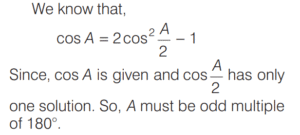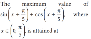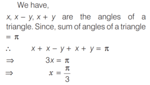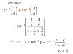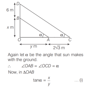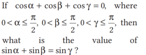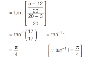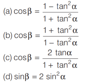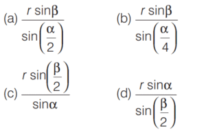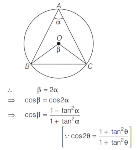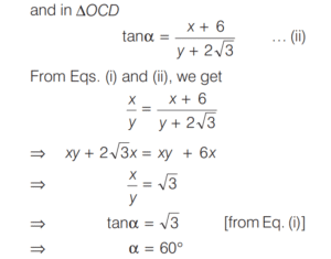 Mathematics NDA/NA SOLVED PAPER 2018 (I) (01 to 50)Total Questions: 5041. If x, x - y and x + y are the angles of a triangle (not an equilateral triangle) such that tan(x - y), tanx and tan(x + y) are in GP, then what is x equal to?(a) π/4(b) π/3(c) π/6(d) π/2Correct Answer: (b) π/3Solution:42. ABC is a triangle inscribed in a circle with centre O. Letα = <BAC, where 45° < α <90°. Let β = ∠BOC. Which one of the following is correct?(a)(b)(c)(d)Correct Answer: (a)Solution:We know that angle subtended by a chord at centre is always double the angle subtended by it at any other part of the circle. 43. If a flage-staff of 6 m height placed on the top of a tower throws a shadow of 2√3 m along the ground, then what is the angle that the sun makes with the ground?(a) 60°(b) 45°(c) 30°(d) 15°Correct Answer: (a) 60°Solution:Let OB and BD be the tower and flag-staff respectively. OA and AC be the shadow of tower and flag-staff respectively. 44. What is tan⁻¹(1/4) + tan⁻¹(3/5) equal to?(a) 0(b) π/4(c) π/3(d) π/2Correct Answer: (b) π/4Solution:45. A spherical balloon of radius r subtends an angle α at the eye of an observer, while the angle of elevation of its centre is β. What is the height of the centre of the balloon (neglecting the height of the observer)?(a)(b)(c)(d)Correct Answer: (a)Solution:Let O bet the centre of the balloon, P be the eye of the observer and <APB be the angle subtendd by the balloon at the eye of the observer. <APB = α46. Simplify the equation?(a)(b)(c)(d)Correct Answer: (a)Solution:47. If sinα + sinβ = 0 = cosα + cosβ, where 0<β<α<2π, then which one of the following is correct?(a) α = π − β(b) α = π + β(c) α = 2π − β(d) 2α = π + 2βCorrect Answer: (b) α = π + βSolution:48. Suppose cosA is given. If only one value of cos(A/2) is possible, then A must be:(a) An odd multiple of 90°(b) A multiple of 90°(c) An odd multiple of 180°(d) A multiple of 180°Correct Answer: (c) An odd multiple of 180°Solution:49. Simplify the question?(a) 0(b) 3(c) 5√2/2(d) 3√2/2Correct Answer: (b) 3Solution:50. Simplify the equation?(a) π/20(b) π/15(c) π/10(d) π/2Correct Answer: (a) π/20Solution:Submit Quiz« Previous12345
