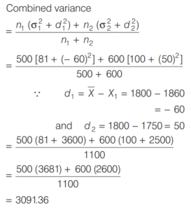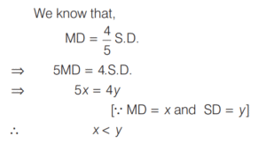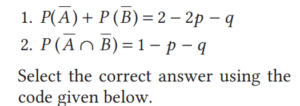 Mathematics NDA/NA SOLVED PAPER 2018 (II) (101 to 120)Total Questions: 2011. If ๐ฅแตข > 0 , ๐ฆ ๐ > 0 โ ( ๐ = 1 , 2 , 3 , . . . , ๐ ) are the values of two variables ๐ and ๐ with geometric means P and Q respectively, then the geometric mean of X/Y is:(a) P/Q(b) antilog (P/Q)(c) n (log P - log Q)(d) n (log P + log Q)Correct Answer: (a) P/QSolution:12. If probability of simultaneous occurrence of two events A and B is p and the probability that exactly one of A, B occurs is q, then which of the following is/are correct?(a) 1 only(b) 2 only(c) Both 1 and 2(d) Neither 1 nor 2Correct Answer: (c) Both 1 and 2Solution:13. If the regression coefficient of Y on X is โ6 and the correlation coefficient between X and Y is -1/2, then the regression coefficient of X on Y would be:(a) 1/24(b) -1/24(c) -1/6(d) 1/6Correct Answer: (b) -1/24Solution:14. The set of bivariate observations (xโ, yโ), (xโ, yโ).........(xโ, yโ) are such that all the values are distinct and all the observations fall on a straight line with non-zero slope. Then the possible values of the correlation coefficient between x and y are:(a) 0 and 1(b) 0 and โ1(c) 0, 1 and โ1(d) โ1 and 1Correct Answer: (d) โ1 and 1Solution:Given that, All the observations fall on a straight line with non-zero, slope then if slope is positive then r = 1 and if slope is negative then r = โ1 So, values of the correlation coefficient between x and y are โ1 and 1.15. Find the answer of given equation?(a) 6/11(b) 35/121(c) 30/121(d) 25/121Correct Answer: (c) 30/121Solution:16. Answer the following question?(a) โน1860, 100(b) โน1750, 100(c) โน1800, 81(d) None of the aboveCorrect Answer: (d) None of the aboveSolution:17. Three dice having digits 1, 2, 3, 4, 5 and 6 on their faces are marked I, II, and III and rolled. Let x, y and z represent the number on die-I, die-II and die-III, respectively. What is the number of possible outcomes such that x > y > z?(a) 14(b) 16(c) 18(d) 20Correct Answer: (d) 20Solution:18. Which one of the following can be obtained from an ogive?(a) Mean(b) Median(c) Geometric Mean(d) ModeCorrect Answer: (b) MedianSolution:We know that, median is always calculated from less than or more than type ogive curve where both curve cuts each other that point median.19. In any discrete series (when all values are not same), if x represents mean deviation about mean and y represents standard deviation, then:which one of the following is correct? (a) y > x (b) y < x (c) x = y (d) x < y(a)(b)(c)(d)Correct Answer: (d)Solution:20. In which one of the following cases would you expect to get a negative correlation?(a) The ages of husbands and wifes(b) Shoe size and intelligence(c) Insurance companies profits and the number of claims they have to pay(d) Amount of rainfall and yield of cropCorrect Answer: (c) Insurance companies profits and the number of claims they have to paySolution:In negative correlation, if x is increases then y is decreases by checking options Insurance companies profits and the number of claims they have to pay are negatively correlated.Submit Quiz« Previous12