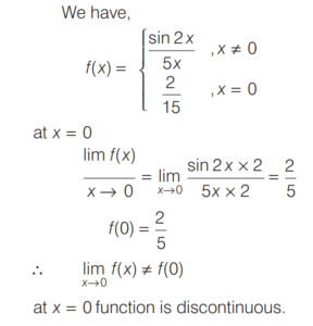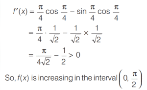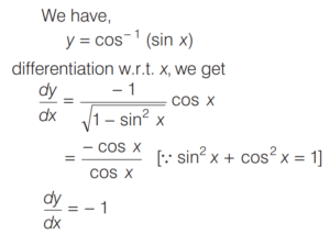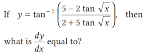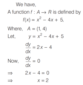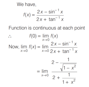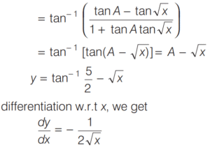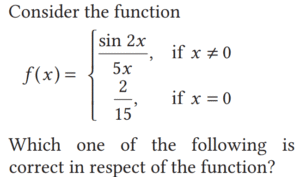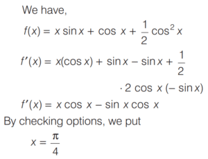 Mathematics NDA/NA SOLVED PAPER 2018 (II) (51 to 100)Total Questions: 5021. Let the slope of the curve y = cos⁻¹(sin x) be tanθ. Then the value of θ in the interval (0, π) is:(a) π/6(b) 3π /4(c) π/4(d) π/2Correct Answer: (b) 3π /4Solution:22. Simplify the equation?(a) (− ∞, 4) ∪ (4, ∞)(b) [4, ∞)(c) (1, 4) ∪ (4, ∞)(d) [1, 4) ∪ (4, ∞)Correct Answer: (d) [1, 4) ∪ (4, ∞)Solution:23. Find the answer of given equation?(a) It is not continuous at x = 0(b) It is continuous at every x(c) It is not continuous at x = π(d) It is continuous at x = 0Correct Answer: (a) It is not continuous at x = 0Solution:24. For the function f(x) = |x - 3|, which one of the following is not correct?(a) The function is not continuous at x = −3(b) The function is continuous at x = 3(c) The function is differentiable at x = 0(d) The function is differentiable at x = −3Correct Answer: (a) The function is not continuous at x = −3Solution:We have, f(x) = |x - 3| We know that, modulus function is continuous in R. So, option (a) is incorrect.25. Find the answer of given equation?(a) -1/3(b) 1/3(c) 2/3(d) 2Correct Answer: (b) 1/3Solution:26. Simplify the equation?(a)(b)(c)(d)Correct Answer: (a)Solution:27. Simplify the equation?(a) -1/2√x(b) 1(c) − 1(d) 1/2√xCorrect Answer: (a) -1/2√xSolution:28. Which one of the following is correct in respect of the function f(x) = x sin x + cos x + 1/2 cos²x?(a) It is increasing in the interval (0, π/2)(b)It remains constant in the interval (0, π/2)(c) It is decreasing in the interval (0, π/2)(d) It is decreasing in the interval (0, π/2)Correct Answer: (a) It is increasing in the interval (0, π/2)Solution:29. Simplify the question?(a) √2(b) 2√2(c) 1/√2(d) -1/2√2Correct Answer: (c) 1/√2Solution:30. A function f : A → R is defined by the equation f (x) = x² - 4x + 5, where A = (1, 4). What is the range of the function?(a) (2, 5)(b) (1, 5)(c) [1, 5)(d) [1, 5]Correct Answer: (c) [1, 5)Solution:Submit Quiz« Previous12345Next »