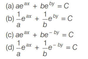 Mathematics NDA/NA SOLVED PAPER 2018 (II) (51 to 100)Total Questions: 5031. Simplify the equation?(a) b - a(b) a - b(c) 0(d) 2(b - a)Correct Answer: (b) a - bSolution:32. Simplify the equation?(a) 2(b) 3(c) 4(d) 9Correct Answer: (d) 9Solution:33. What is ∫sin³x cos x dx equal to?(a)(b)(c)(d)Correct Answer: (d)Solution:34. Simplify the equation?(a)(b)(c)(d)Correct Answer: (b)Solution:35. Simplify the question?(a) 0(b) − π/4(c) − π/2(d) π/2Correct Answer: (d) π/2Solution:36. In which one of the following intervals is the function f(x) = x²- 5x + 6 decreasing?(a) (−∞, 2](b) [3, ∞)(c) (−∞, ∞)(d) (2, 3)Correct Answer: (a) (−∞, 2]Solution:37. The differential equation of the family of curves y = p cos(ax) + q sin(ax), where p, q are arbitrary constants, is:(a)(b)(c)(d)Correct Answer: (d)Solution:38. The equation of the curve passing through the point (-1, -2), which satisfies dy/dx = -x² - 1/x³, is:(a) 17x²y − 6x² + 3x⁵ − 2 = 0(b) 6x²y + 17x² + 2x⁵ − 3 = 0(c) 6xy − 2x² + 17x⁵ + 3 = 0(d) 17x²y + 6xy − 3x⁵ + 5 = 0Correct Answer: (b) 6x²y + 17x² + 2x⁵ − 3 = 0Solution:39. What is the order of the differential equation whose solution is y = a cos x + b sin x + ce⁻ˣ + d, where a, b, c and d are arbitrary constants?(a) 1(b) 2(c) 3(d) 4Correct Answer: (d) 4Solution:40. What is the solution of the differential equation ln(dy/dx) = ax + by?(a)(b)(c)(d)Correct Answer: (d)Solution:Submit Quiz« Previous12345Next »