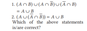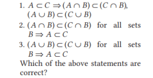 Mathematics (NDA/NA SOLVED PAPER 2019 (I) (01 to 50)Total Questions: 501. What is the nth term of the sequence 25, -125, 625, -3125.......?(a)(b)(c)(d)Correct Answer: (d)Solution:2. Suppose X = {1, 2, 3, 4} and R is a relation on X. If R = {(1,1), (2,2), (3,3), (1,2), (2,1), (2,3), (3,2)}, then which one of the following is correct?(a) R is reflexive and symmetric, but not transitive(b) R is symmetric and transitive, but not reflexive(c) R is reflexive and transitive, but not symmetric(d) R is neither reflexive nor transitive, but symmetricCorrect Answer: (d) R is neither reflexive nor transitive, but symmetricSolution:3. A relation R is defined on the set N of natural numbers as xRy ⇒ x² -4xy +3y² = 0. Then, which one of the following is correct?(a) R is reflexive and symmetric, but not transitive(b) R is reflexive and transitive, but not symmetric(c) R is reflexive, symmetric and transitive(d) R is reflexive, but neither symmetric nor transitiveCorrect Answer: (d) R is reflexive, but neither symmetric nor transitiveSolution:4. If A ={x ∈ Z : x³− 1 = 0} and B = {x ∈ Z : x²+ x + 1 = 0}, where, Z is set of complex numbers, then what is A ∩ B equal to?(a)(b)(c)(d)Correct Answer: (b)Solution:5. Consider the following statements for the two non-empty sets A and B.(a) Only 1(b) Only 2(c) Both 1 and 2(d) Neither 1 nor 2Correct Answer: (a) Only 1Solution:6. Let X be a non-empty set and let A, B, C be subsets of X. Consider the following statements:(a) Only 1 and 2(b) Only 2 and 3(c) Only 1 and 3(d) 1, 2 and 3Correct Answer: (d) 1, 2 and 3Solution:7. Simplify the question?(a)(b)(c)(d)Correct Answer: (a)Solution:8. What are the roots of the equation |x² - x - 6| = x + 2?(a) -2, 1, 4(b) 0, 2, 4(c) 0, 1, 4(d) −2, 2, 4Correct Answer: (d) −2, 2, 4Solution:9. Find the answer of given question below?(a) singular matrix(b) involutory matrix(c) nilpotent matrix(d) idempotent matrixCorrect Answer: (b) involutory matrixSolution:10. Simplify the question:(a) −3, 4(b) 3, 4(c) 3, -4(d) -3, -4Correct Answer: (a) −3, 4Solution:Submit Quiz12345Next »