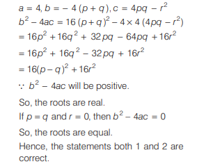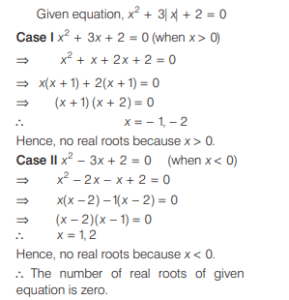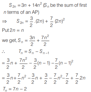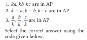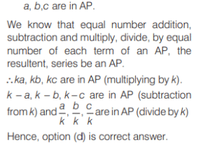 Mathematics NDA/NA SOLVED PAPER 2019 (II) (01 to 50)Total Questions: 5031. Let a, b, c be in AP and k ≠ 0 be a real number. Which of the following are correct?(a) 1 and 2 only(b) 2 and 3 only(d) 1, 2 and 3(d) 1, 2 and 3Correct Answer: (d) 1, 2 and 3Solution:32. How many two-digit numbers are divisible by 4?(a) 21(b) 22(c) 24(d) 25Correct Answer: (b) 22Solution:33. Let Sn be the sum of the first n terms of an AP. If S₂ₙ = 3n + 14n², then what is the common difference?(a) 5(b) 6(c) 7(d) 9Correct Answer: (c) 7Solution:Put n = 1, 2....... T₁ = 7(1) - 2 = 5 T₂ = 7(2) - 2 = 12 d = T₂ - T₁ = 12 - 5 = 734. If 3rd, 8th and 13th terms of a GP are p q, and r respectively, then which one of the following is correct?(a) q² = pr(b) r² = pq(c) pqr = 1(d) 2q = p+ rCorrect Answer: (a) q² = prSolution:35. Find the answer of given question?(a)(b)(c)(d)Correct Answer: (c)Solution:36. Find the answer of given question?(a)(b)(c)(d)Correct Answer: (b)Solution:37. How many real roots does the equation x² + 3 |x| + 2 = 0 have?(a) Zero(b) One(c) Two(d) FourCorrect Answer: (a) ZeroSolution:38. Consider the following statements in respect of the quadratic equation 4(x - p) (x - q) - r² = 0.where p q, and r are real numbers. 1. The roots are real. 2. The roots are equal, if p = q and r = 0. Which of the above statements is/are correct?(a) Only 1(b) Only 2(c) Both 1 and 2(d) Neither 1 nor 2Correct Answer: (c) Both 1 and 2Solution:39. Let S = {2, 4, 6, 8,............,20}. What are the maximum number of subsets of S?(a) 10(b) 20(c) 512(d) 1024Correct Answer: (d) 1024Solution:40. A binary number is represented by (cdccddcccddd)₂, where c > d. What is its decimal equivalent?(a) 1848(b) 2048(c) 2842(d) 2872Correct Answer: (d) 2872Solution:Submit Quiz« Previous12345Next »