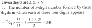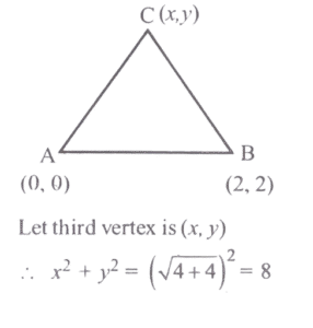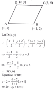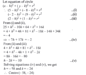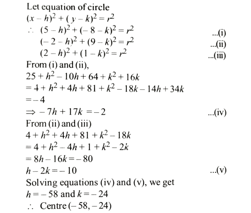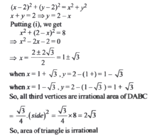Mathematics NDA/NA SOLVED PAPER 2021-II (01 to 50)Total Questions: 5031. Consider the digits 3, 5, 7, 9. What is the number of 5-digit numbers formed by these digits in which each of these four digits appears?(a) 240(b) 180(c) 120(d) 60Correct Answer: (a) 240Solution:32. How many distinct matrices exist with all four entries taken from {1, 2}?(a) 16(b) 24(c) 32(d) 48Correct Answer: (a) 16Solution:Number of matrices exist with all four entries taken from(1, 2) = 2 × 2 × 2 × 2 = 16.33. If i = √-1, then how many values does i⁻²ⁿ have for different n ∈ Z?(a) One(b) Two(c) Four(d) InfiniteCorrect Answer: (b) TwoSolution:34. If x = a/b - c, y = b/c - a, z = c/a - b then what is the value of the following?(a) 0(b) 1(c) abc(d) ab + bc + caCorrect Answer: (a) 0Solution:35. Consider the following in respect of the Matrix1. Inverse of A does not exist 2. A³ = A 3. 3A = A² Which of the above are correct?(a) 1 and 2 only(b) 2 and 3 only(c) 1 and 3 only(d) 1, 2 and 3Correct Answer: (c) 1 and 3 onlySolution:36. What are the coordinates of the centre of the circle?A circle is passing through the points (5, -8), (-2, 9) and (2, 1).(a) (-2,-50)(b) (50,20)(c) (-24,-58)(d) (-58,-24)Correct Answer: (d) (-58,-24)Solution:37. If r is the radius of the circle, then which one of the following is correct?A circle is passing through the points (5, -8), (-2, 9) and (2, 1).(a) r < 10(b) 10 < r < 30(c) 30 < r < 60(d) r > 60Correct Answer: (d) r > 60Solution:38. Consider the following statements:The two vertices of an equilateral triangle are (0, 0) and (2, 2). 1. The third vertex has at least one irrational coordinate. 2. The area is irrational. Which of the above statements is/are correct?(a) 1 only(b) 2 only(c) Both 1 and 2(d) Neither 1 nor 2Correct Answer: (c) Both 1 and 2Solution:39. The difference of coordinates of the third vertex isThe two vertices of an equilateral triangle are (0, 0) and (2, 2).(a) 0(b) √3(c) 2√2(d) 2√3Correct Answer: (d) 2√3Solution:40. What is the equation of the diagonal BD?The coordinates of three consecutive vertices of a parallelogram ABCD are A(1, 3), B(- 1, 2) and C (3, 5).(a) 2x - 3y + 2 = 0(b) 3x - 2y + 5 = 0(c) 2x - 3y + 8 = 0(d) 3x - 2y - 5 = 0Correct Answer: (c) 2x - 3y + 8 = 0Solution:Submit Quiz« Previous12345Next »