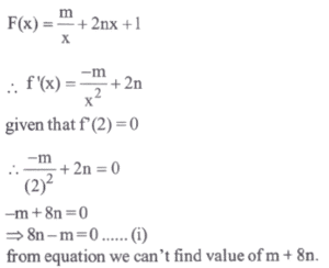 MATHEMATICS (NDA/NA SOLVED PAPER 2022-I) (51 to 100)Total Questions: 5021. Let y = [x + 1], - 4 < x < - 3 where [.] is the greatest integer function. What is the derivative of y with respect to x at x = - 3.5?(a) 4(b) -3.5(c) -3(d) 0Correct Answer: (d) 0Solution:22. If dy/dx = (l n 5) y with y(0) = ln(5), then what is y(1) equal to?(a) 0(b) 5(c) 2 ln 5(d) 5 ln 5Correct Answer: (d) 5 ln 5Solution:23. Consider the following in respect of the function f(x) = 10ˣ:1. Its domain is (- ∞, ∞) 2. It is a continuous function 3. It is differentiable at x = 0 Which of the above statements are correct?(a) 1 and 2 only(b) 2 and 3 only(c) 1 and 3 only(d) 1, 2 and 3Correct Answer: (d) 1, 2 and 3Solution:24. equal to?(a) 0(b) 1/2(c) 1(d) Limit does not existCorrect Answer: (a) 0Solution:25. equal to?(a) 0(b) 3(c) 6(d) Limit does not existCorrect Answer: (c) 6Solution:26. In which one of the following intervals is the function(a) (-∞, 1) only(b) (1, 6)(c) (6, ∞) only(d) (-∞, 1) ∪ (6, ∞)Correct Answer: (b) (1, 6)Solution:27. If the derivative of the function f(x) = m/x + 2nx + 1 vanishes at x = 2, then what is the value of m + 8n?(a) -2(b) 0(c) 2(d) Cannot be determined due to insufficient dataCorrect Answer: (d) Cannot be determined due to insufficient dataSolution:28. What is the area included in the first quadrant between the curves y = x and y = x³?(a) 1/8 square unit(b) 1/4 square unit(c) 1/2 square unit(d) 1 square unitCorrect Answer: (b) 1/4 square unitSolution:29. If xy = 4225 where x, y are natural numbers, then what is the minimum value of x + y?(a) 130(b) 260(c) 2113(d) 4226Correct Answer: (a) 130Solution:30. What does the equation xdy/dx - 2y = 0 represent?(a) A family of straight(b) A family of circles(c) A family of parabolas(d) A family of ellipsesCorrect Answer: (c) A family of parabolasSolution:Submit Quiz« Previous12345Next »