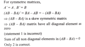 Mathematics (NDA/NA SOLVED PAPER 2023-I) (01 to 50)Total Questions: 501. If ω is a non-real cube root of 1, then what is the value of(a) √3(b) √2(c) 1(d) 4/√3Correct Answer: (a) √3Solution:2. What is the number of 6 digit numbers that formed only by using 0, 1, 2, 3, 4 and 5 (each once); and divisible by 6?(a) 96(b) 120(c) 192(d) 312Correct Answer: (d) 312Solution:3. What is the binary number equivalent to decimal number 1011?(a) 1011(b) 111011(c) 11111001(d) 111110011Correct Answer: (b) 111011Solution:4. Find the value?(a) 12(b) 13(c) 17(d) 24Correct Answer: (b) 13Solution:5. Find the value?(a) √3(b) √2(c) 1(d) 1/√3Correct Answer: (d) 1/√3Solution:6. Let A and B be symmetric matrices of same order, then which one of the following is correct regarding (AB-BA)?1. Its diagonal entries are equal but non-zero 2. The sum of its non-diagonal entries is zero Select the correct answer using the code given below:(a) 1 only(b) 2 only(c) Both 1 and 2(d) Neither 1 nor 2Correct Answer: (b) 2 onlySolution:7. Consider the following statements in respect of square matrices A, B, C each of same order n:1. AB = AC ⇒ B = C if A is non-singular 2. If BX = CX for every column matrix X having n rows then B = C Which of the statement given above is/are correct?(a) 1 only(b) 2 only(c) Both 1 and 2(d) Neither 1 nor 2Correct Answer: (a) 1 onlySolution:8. The system of linear equations x + 2y + z = 4, 2x + 4y + 2z = 8 and 3x + 6y + 3z = 10 has(a) a unique solution(b) infinite many solutions(c) no solution(d) exactly three solutionsCorrect Answer: (c) no solutionSolution:9. Let AX = B be a system of 3 liner equations with 3-unknowns. Let X₁ and X₂ be its two distinct solutions. If the combination aX₁ + bX₂ is a solution of AX = B where a, b, are real numbers, then which one of the following is correct?(a) a = b(b) a + b = 1(c) a + b = 0(d) a - b = 1Correct Answer: (b) a + b = 1Solution:10. What is the sum of the roots of the equation(a) a + b + c(b) a - b + c(c) a + b - c(d) a - b - cCorrect Answer: (b) a - b + cSolution:Submit Quiz12345Next »