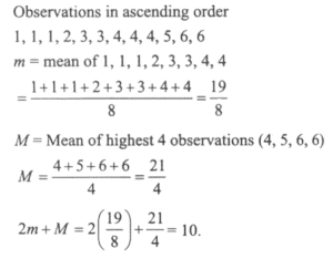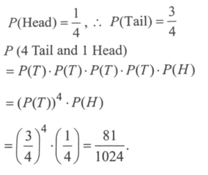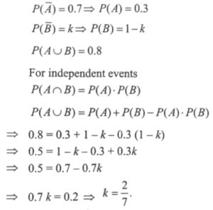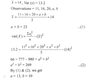 Mathematics (NDA/NA SOLVED PAPER 2023-I) (101 to 120)Total Questions: 201. The mean and variance of five observations are 14 and 13.2 respectively. Three of the five observations are 11, 16 and 20. What are the other two observations?(a) 8 and 15(b) 9 and 14(c) 10 and 13(d) 11 and 12Correct Answer: (c) 10 and 13Solution:2. Let A and B be two independent events such thatWhat is the value of k?(a) 5/7(b) 0(c) 2/7(d) -Correct Answer: (c) 2/7Solution:3. A biased coin with the probability of getting head equal to 1/4 is tossed five times. What is the probability of getting tail in all the first four tosses followed by head?(a) 81/512(b) 81/1024(c) 81/256(d) 27/1024Correct Answer: (b) 81/1024Solution:4. A coin is biased so that heads comes up thrice as likely as tails. In four independent tossess of the coin, what is probability of getting exactly three heads?(a) 81/256(b) 27/64(c) 27/256(d) 9/256Correct Answer: (b) 27/64Solution:Heads comes up thrice as likely as tails ⇒ P(H) = 3P(T) and P(H) + P(T) = 1 P(H) = 3/4 P(T) = 1/4 P (3 head and 1 tail) = 4c₃ 3/4 × 3/4 × 3/4 × 1/4 = 27/64.5. Let X and Y be two random variables such that X + Y = 100. If X follows Binomial distribution with parameters n = 100 and p = 4/5, what is the variance of Y?(a) 1(b) 1/2(c) 16(d) 1/16Correct Answer: (c) 16Solution:Var(X) = npq = 100 × 4/5 × 1/5 = 16 Var(Y) = var(100 - X) = var(X) = 166. If two lines of regression are x + 4y + 1 = 0 and 4x + 9y + 7 = 0, then what is the value of x when y = - 3 ?(a) -13(b) -5(c) 5(d) 7Correct Answer: (c) 5Solution:x + 4y + 1 = 0 ...(1) 4x + 9y + 7 = 0 ...(2) Putting y = - 3 in (1) and (2) From (1), x = 11 which is not in option From (2), x = 57. The central angies p, q, r and s (in degrees) of four sectors in a Pie Chart satisfy the relation 9p = 3q = 2r = 6s. What is the value of 4p - q?(a) 12(b) 24(c) 30(d) 36Correct Answer: (d) 36Solution:8. The observations 4 1, 4, 3, 6, 2, 1, 3, 4, 5, 1, 6 are outputs of 12 dices thrown simultaneously. If m and M are means of lowest 8 observations and highest 4 observations respectively, then what is (2m + M) equal to?(a) 10(b) 12(c) 17(d) 21Correct Answer: (a) 10Solution:9. The bivariate data set contains only two points (-1, 1) and (3, 2) What will be the line of regression of y on x?(a) x - 4y + 5 = 0(b) 3x + 2y - 1 = 0(c) x + 4y + 1 = 0(d) 5x - 4y + 1 = 0Correct Answer: (a) x - 4y + 5 = 0Solution:For line of regression of y on x, the line will be one which satisfy both points. Clearly, x - 4y + 5 = 0 satisfy (-1, 1) and (3, 2) both. Hence line is x - 4y + 5 = 0.10. A die is thrown 10 times and obtained the following outputs:1, 2, 1, 1, 2, 1, 4, 6, 5, 4 What will be the mode of data so obtained?(a) 6(b) 4(c) 2(d) 1Correct Answer: (d) 1Solution:Mode Data observations with maximum frequency Mode = 1.Submit Quiz12Next »