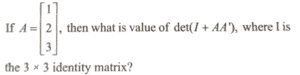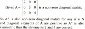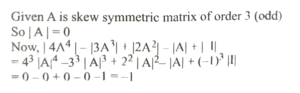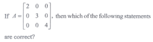 (Mathematics) NDA/NA SOLVED PAPER 2023 – II (01 to 50)Total Questions: 501. Find?(a) Straight lines(b) rectangular hyperbolas(c) parabolas(d) circlesCorrect Answer: (d) circlesSolution:2. If 1! + 3! + 5! + 7!+_____+199! is divided by 24, what is the remainder?(a) 3(b) 6(c) 7(d) 9Correct Answer: (c) 7Solution:3. Find value?(c) 5√2(a) 24(b) 25(d) 5(√2 - 1)Correct Answer: (c) 5√2Solution:4. Find matrix?(a) 15(b) 6(c) 0(d) -1Correct Answer: (a) 15Solution:5. If A, B and C are square matrices of order 3 and det(BC) = 2det(A), then what is the value of det(2A⁻¹BC)?(a) 16(b) 8(c) 4(d) 2Correct Answer: (a) 16Solution:6. If the nᵗʰ term of a sequence is (2n + 5)/7, then what is the sum of its first 140 terms?(a) 2840(b) 2780(c) 2920(d) 5700Correct Answer: (c) 2920Solution:7. Let A be a skew-symmetric matrix of order 3. What is the value ofdet(4A⁴) - det(3A³) + det(2A²) - det(A) + det(-I) Where I is the identity matrix of order 3?(a) -1(b) 0(c) 1(d) 2Correct Answer: (a) -1Solution:8. Find?(a) A² is symmetric matrix with det(A²) = 0(b) A² is symmetric matrix with det(A²) ≠ 0(c) A² is skew-symmetric matrix with det(A²) = 0(d) A² is skew-symmetric matrix with det(A²) ≠ 0Correct Answer: (a) A² is symmetric matrix with det(A²) = 0Solution:9. Find?1. Aⁿ will always be singular for any positive integer n.2. Aⁿ will always be a diagonal matrix for any positive integer n.3. Aⁿ will always be a symmetric matrix for any positive integer n.Select the correct answer using the code given below:(a) 1 and 2 only(b) 2 and 3 only(c) 1 and 3 only(d) 1, 2 and 3Correct Answer: (b) 2 and 3 onlySolution:10. If (a + b), 2b, (b + c) are in HP, then which one of the following is correct?(a) a, b and c are in AP(b) a - b, b - c and c - a are in AP(c) a, b and c are in GP(d) a - b, b - c and c - a are in GPCorrect Answer: (c) a, b and c are in GPSolution:Submit Quiz12345Next »