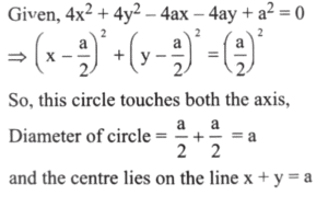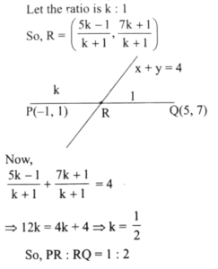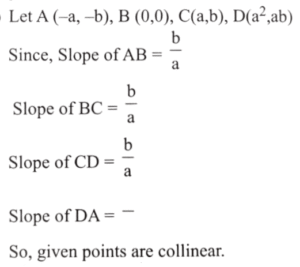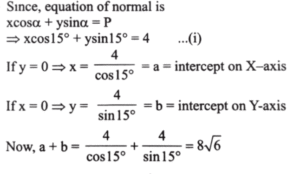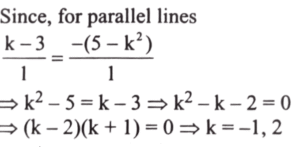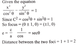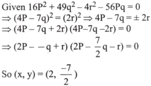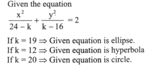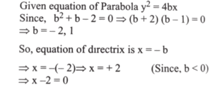 (Mathematics) NDA/NA SOLVED PAPER 2023 – II (51 to 100)♠Total Questions: 5031. What is the equation of directrix of parabola y²= 4bx, where b < 0 and b² + b - 2 = 0?(a) x + 1 = 0(b) x - 2 = 0(c) x - 1 = 0(d) x + 2 = 0Correct Answer: (b) x - 2 = 0Solution:32. The points (- a, - b) (0, 0), (a, b) and (a², ab) are:(a) lying on the same circle(b) vertices of a square(c) vertices of a parallelogram that is not a square(d) collinearCorrect Answer: (d) collinearSolution:33. Given that 16p² + 49q² - 4r²- 56pq = 0 which one of the following is a point on a pair of straight lines (px + qy + r)(px + qy - r) = 0?(a) (2, 7/2)(b) (2, -7/2)(c) (4, - 7)(d) (4, 7)Correct Answer: (b) (2, -7/2)Solution:34. If 3x + y - 5 = 0 is the equation of a chord of the circle x²+ y² - 25 = 0 then what are the coordinates of the mid-point of the chord?(a) (3/4, 1/4)(b) (3/2 , 1/2)(c) (3/4, - 1/4)(d) (3/2, -1/2)Correct Answer: (b) (3/2 , 1/2)Solution:(b)35. Consider the following in respect of the equation1. The equation represents an ellipse if k = 19 2. The equation represents a hyperbola if k = 12 3. The equation represents a circle if k = 20 How many of the statements given above are correct?(a) Only one(b) Only two(c) All three(d) NoneCorrect Answer: (c) All threeSolution:36. Consider the following statements in respect of hyperbola1. The two foci are independent of 0. 2. The eccentricity is sec θ. 3. The distance between the two foci is 2 units. How many of the statements given above are correct?(a) Only one(b) Only two(c) All three(d) NoneCorrect Answer: (c) All threeSolution:37. Consider the following in respect of the circle4x² + 4y² - 4ax - 4ay + a² = 0 1. The circle touches both the axes. 2. The diameter of the circle is 2a. 3. The centre of the circle lies on the line x + y = a How many of the statements given above are correct(a) Only one(b) Only two(c) All three(d) NoneCorrect Answer: (b) Only twoSolution:38. For what value of k is the line (k - 3)x - (5 - k²)y + k² - 7k + 6 = 0 parallel to the line x + y = 1?(a) -1, 1(b) -1, 2(c) 1, -2(d) 2, -2Correct Answer: (b) -1, 2Solution:39. The line x + y = 4 cuts the line joining P(- 1,1) and Q (5, 7) at R. What is PR: RQ equal to ?(a) 1 : 1(b) 1 : 2(c) 2 : 1(d) 1 : 3Correct Answer: (b) 1 : 2Solution:40. What is the sum of the intercepts of the line whose perpendicular distance from origin is 4 units and the angle which the normal makes with positive DIRECTIONS of x-axis is 15°?(a) 8(b) 4√6(c) 8√6(d) 16Correct Answer: (c) 8√6Solution:Submit Quiz« Previous12345Next »