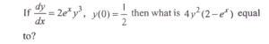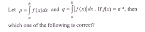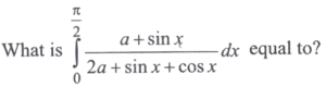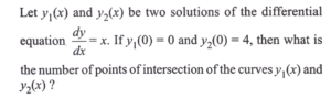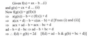 (Mathematics) NDA/NA SOLVED PAPER 2024 – I (51 to 100)Total Questions: 5021. Find the points?(a) No point(b) One point(c) Two points(d) More than two pointsCorrect Answer: (a) No pointSolution:(a)22. Find the value?(a)(b)(c)(d)Correct Answer: (c)Solution:23. If f(x) = ax - b and g(x) = cx + d are such that f(g(x)) = g(f(x)), then which one of the following holds?(a) f(d) = g(b)(b) f(b) + g(d) = 0(c) f(a) + g(c) = 2a(d) f(d) + g(b) = 2dCorrect Answer: (d) f(d) + g(b) = 2dSolution:24. equal to?(a) -1/4(b) 0(c) 1/2(d) 1/4Correct Answer: (b) 0Solution:25. What are the order and degree respectively of the differential equation(a) 2,2(b) 2,3(c) 5,2(d) 2,5Correct Answer: (d) 2,5Solution:26. equal to?(a) 1(b) 2(c) 3(d) 4Correct Answer: (a) 1Solution:27. choose the correct option?(a) p = 2q(b) p = -q(c) 4p = q(d) p = qCorrect Answer: (d) p = qSolution:28. equal to?(a) π/4(b) π/2(c) 1(d) 0Correct Answer: (a) π/4Solution:29. Find the value?(a)(b)(c)(d)Correct Answer: (d)Solution:30. Which one of the following is correct in respect of(a) f(x) has some domain and g(x) has no domain(b) f(x) has no domain and g(x) has some domain(c) f(x) and g(x) have the same domain(d) f(x) and g(x) do not have any domainCorrect Answer: (a) f(x) has some domain and g(x) has no domainSolution:Submit Quiz« Previous12345Next »