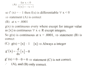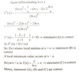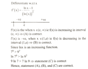 (Mathematics) NDA/NA SOLVED PAPER 2024 – I (51 to 100)Total Questions: 5031. What is the value of α ?(a) 7(b) 13(c) 17(d) 26Correct Answer: (d) 26Solution:(d) α = 2632. What is the value of β?(a) 7(b) 13(c) 17(d) 26Correct Answer: (a) 7Solution:β = 733. Consider the following statements:(A) f(x) is increasing in the interval (e, ∞) (B) f(x) is decreasing in the interval (1, e) (C) 9 ln(7) > 7 ln(9) Which of the statements given above are correct?(a) (A) and (B) only(b) (B) and (C) only(c) (A) and (C) only(d) (A), (B) and (C)Correct Answer: (d) (A), (B) and (C)Solution:34. Consider the following statements:(A) f "(e) = 1/e(B) f(x) attain local minimum value at x = e(C) A local minimum value f(x) is eWhich of the statements given above are correct?(a) (A) and (B) only(b) (B) and (C) only(c) (A) and (C) only(d) (A), (B), and (C)Correct Answer: (d) (A), (B), and (C)Solution:35. What is g[f(x) - 3x] equal to?(a)(b)(c)(d)Correct Answer: (a)Solution:36. What is f "(x) equal to?(a) -2/x³(b) 2x + 2/x³(c) 6x + 3(d) 6xCorrect Answer: (d) 6xSolution:37. Consider the following statements:(A) f(x) is differentiable for all x < 0 (B) g(x) is continuous at x = 0.0001 (C) The derivative of g(x) at x = 2.5 is 1 Which of the statements given above are correct?(a) A and B only(b) B and C only(c) A and C only(d) A, B and CCorrect Answer: (a) A and B onlySolution:38. equal to?(a) -3/2(b) -1/2(c) 1/2(d) 3/2Correct Answer: (a) -3/2Solution:39. What is φ (a) equal to ?(a) 0(b) a(c) 100 a(d) 200Correct Answer: (d) 200Solution:40. What is φ'(a) equal to?(a) 0(b) π(c) 100(d) 200Correct Answer: (a) 0Solution:Φ(a) = 200Differentiating w.r.t aΦ' (a) = 0Submit Quiz« Previous12345Next »