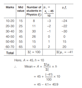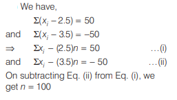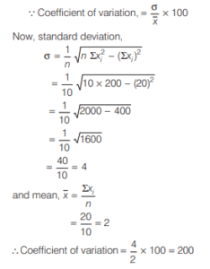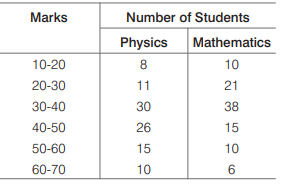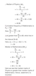 Mathematics (NDA SOLVED PAPER 2020 – II) (101 to 120)Total Questions: 201. The numbers 4 and 9 have frequencies x and (x − 1) respectively. If their arithmetic mean is 6, then what is the value of x?(a) 2(b) 3(c) 4(d) 5Correct Answer: (b) 3Solution:2. If three dice are rolled under the condition that no two dice show the same face, then what is the probability that one of the faces is having the number 6?(a) 5/6(b) 5/9(c) 1/2(d) 5/12Correct Answer: (c) 1/2Solution:3. Find the value?(a)(b)(c)(d)Correct Answer: (c)Solution:4. The sum of deviations of n number of observations measured from 2.5 is 50. The sum of deviations of the same set of observations measured from 3.5 is − 50. What is the value of n?(a) 50(b) 60(c) 80(d) 100Correct Answer: (d) 100Solution:5. A data set of n observations has mean 2M, while another data set of 2n observations has mean M. What is the mean of the combined data sets?(a) M(b) 3M/2(c) 2M/3(d) 4M/3Correct Answer: (d) 4M/3Solution:6. The difference between number of students under Physics and Mathematics is largest for the interval(Question:- 106-108) Read the following information and answer the three items that follow. (a) 20-30(b) 30-40(c) 40-50(d) 50-60Correct Answer: (c) 40-50Solution:7. Consider the following statements:1. Modal value of the marks in Physics lies in the interval 30-40. 2. Median of the marks in Physics is less than of marks in Mathematics. Which of the above statements is/are correct? (a) 1 Only(b) 2 Only(c) Both 1 and 2(d) Neither 1 nor 2Correct Answer: (a) 1 OnlySolution:8. What is the mean of marks in Physics?(a) 38.4(b) 39.4(c) 40.9(d) 41.6Correct Answer: (c) 40.9Solution:9. What is the standard deviation of the observations √6, -√5, -√4, -1, 1, √4, √5, √6?(a) √2(b) 2(c) 2√2(d) 4Correct Answer: (b) 2Solution:10. If Σxᵢ = 20, Σxᵢ² = 200 and n = 10 for an observed variable x, then what is the coefficient of variation?(a) 80(b) 100(c) 150(d) 200Correct Answer: (d) 200Solution:Submit Quiz12Next »