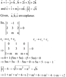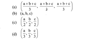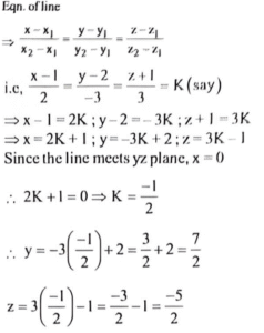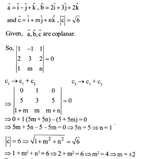 (Mathematics-Part-2) NDA/NA Solved Paper 2017-ITotal Questions: 5011. A straight line with direction cosines (0, 1, 0) is(a) parallel to x-axis(b) parallel to y-axi(c) parallel to z-axis(d) equally inclined to all the axesCorrect Answer: (b) parallel to y-axiSolution:D.C's(0, 1,0) Since x and z are zero, the straight line is parallel to y-axis12. (0, 0, 0), (a, 0, 0), (0, b, 0) and (0, 0, c) are four distinct points. What are the coordinates of the point which is equidistant from the four points?(a)(b)(c)(d)Correct Answer: (c)Solution:13. The points P(3, 2, 4), Q(4, 5, 2), R(5, 8, 0) and S(2, -1, 6) are(a) vertices of a rhombus which is not a square(b) non-coplanar(c) collinear(d) coplanar but not collinearCorrect Answer: (c) collinearSolution:14. The line passing through the points (1, 2, -1) and (3, -1, 2) meets the yz-plane at which one of the following points?(a)(b)(c)(d)Correct Answer: (d)Solution:15. Under which one of the following conditions are the lines x = ay + b; z = cy + d and x = ey + f ; z = gy + h perpendicular?(a) ae + cg -1 = 0(b) ae + bf - 1 = 0(c) ae+ cg +1 = 0(d) ag + ce + 1 = 0Correct Answer: (c) ae+ cg +1 = 0Solution:16. Solve the following equation:(a) m=2 and n=±1(b) m=±2 and n=-1(c) m=2 and n =-1(d) m=±2 and n = 1Correct Answer: (d) m=±2 and n = 1Solution:17. Solve the following question: (a)(b)(c)(d)Correct Answer: (b)Solution: 18. ABCD is a quadrilateral whose diagonals are AC and BD. Which one of the following is correct?(a)(b)(c)(d)Correct Answer: (b)Solution:19. Solve the following question:(a)(b)(c)(d)Correct Answer: (a)Solution: 20. Solve the following equation:(a) 2(b) 3(c) 4(d) 5Correct Answer: (b) 3Solution:Submit Quiz« Previous12345Next »