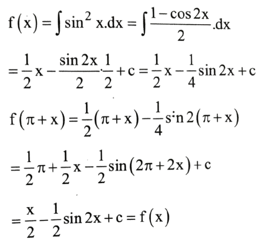 (Mathematics-Part-2) NDA/NA Solved Paper 2017-ITotal Questions: 5031. If f : R → R and g : R → R, then (f - g) is(a) one-one and in to(b) neither one-one nor on to(c) many-one and on to(d) one-one and on toCorrect Answer: (d) one-one and on toSolution: 32. What is the length of the longest interval in which the function f (x) = 3 sin x - 4 sin³ x is increasing?(a) π/3(b) π/2(c) 3π/2(d) πCorrect Answer: (a) π/3Solution:33. If xdy = y (dx + ydy); y(1) = 1 and y(x) > 0, then what is y(-3) equal to?(a) 3(b) 2(c) 1(d) 0Correct Answer: (a) 3Solution:34. What is the maximum value of the function f (x) = 4 sin² x + 1?(a) 5(b) 3(c) 2(d) 1Correct Answer: (a) 5Solution:We know, - 1≤ sinx ≤1 ⇒ 0≤sin²x≤1 ⇒ 0≤4sın²x ≤4 ⇒ 1≤4sin²x + 1≤535. Let f (x) be an indefinite integral of sin² x. Consider the following statements:Statement 1 : The function f(x) satisfies f(x + π)= f(x) for all real x. Statement 2 : sin² (x + π) = sin² x for all real x. Which one of the following is correct in respect of the above statements?(a) Both the statements are true and Statement 2 is the correct explanation of Statement 1(b) Both the statements are true but Statement 2 is not the correct explanation of Statement 1(c) Statement 1 is true but Statement 2 is false(d) Statement I is false but Statement 2 is trueCorrect Answer: (b) Both the statements are true but Statement 2 is not the correct explanation of Statement 1Solution:So, Statement 1 is true. sin² (π+x)=sin²x (-sinx)²=sin²x ⇒sin²x=sin²x So, statement 2 is truе36. What are the degree and order respectively of the difrantal equenion y = x (dy/dx)² + (dx/dy)² ?(a) 1,2(b) 2,1(c) 1,4(d) 4,1Correct Answer: (d) 4,1Solution:37. What is the differential equation corresponding to y² - 2ay + x² = a² by eliminating a?where p = dy/dx(a) (x²- 2y²)p² - 4 pxy - x²=0(b) (x² - 2y²) p² + 4 pxy - x²=0(c) (x²+2y²)p² - 4 pxy - x²= 0(d) (x²+2y²)p²- 4 pxy + x²=0Correct Answer: (a) (x²- 2y²)p² - 4 pxy - x²=0Solution: 38. What is the general solution of the differential equation ydx - (x+ 2y²) dy=0?(a) x = y²+ cy(b) x = 2cу²(c) x = 2y²+ cy(d) None of the aboveCorrect Answer: (c) x = 2y²+ cySolution:39. Let ƒ (x + y) = ƒ (x) ƒ(y) for all x and y. Then what is ƒ '(5) equal to [where ƒ'(x) is the derivative of f (x)]?(a) ƒ(5) ƒ'0(b) ƒ(5) - ƒ'(0)(c) ƒ(5)ƒ(0)(d) ƒ(5) + ƒ'(0)Correct Answer: (a) ƒ(5) ƒ'0Solution:40. Solve the following equation? (a)(b)(c)(d)Correct Answer: (b)Solution: Submit Quiz« Previous12345Next »