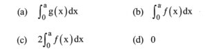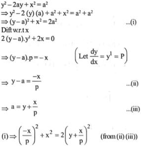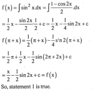 (Mathematics-Part-2) NDA/NA Solved Paper 2017-ITotal Questions: 5031. If f : R → R and g : R → R, then (f - g) is(a) one-one and in to(b) neither one-one nor on to(c) many-one and on to(d) one-one and on toCorrect Answer: (d) one-one and on toSolution: 32. What is the length of the longest interval in which the function f (x) = 3 sin x - 4 sin³ x is increasing?(a) π/3(b) π/2(c) 3π/2(d) πCorrect Answer: (a) π/3Solution:33. If xdy = y (dx + ydy); y(1) = 1 and y(x) > 0, then what is y(-3) equal to?(a) 3(b) 2(c) 1(d) 0Correct Answer: (a) 3Solution:34. What is the maximum value of the function f (x) = 4 sin² x + 1?(a) 5(b) 3(c) 2(d) 1Correct Answer: (a) 5Solution:We know, - 1≤ sinx ≤1 ⇒ 0≤sin²x≤1 ⇒ 0≤4sın²x ≤4 ⇒ 1≤4sin²x + 1≤535. Let f (x) be an indefinite integral of sin² x. Consider the following statements:Statement 1 : The function f(x) satisfies f(x + π)= f(x) for all real x. Statement 2 : sin² (x + π) = sin² x for all real x. Which one of the following is correct in respect of the above statements?(a) Both the statements are true and Statement 2 is the correct explanation of Statement 1(b) Both the statements are true but Statement 2 is not the correct explanation of Statement 1(c) Statement 1 is true but Statement 2 is false(d) Statement I is false but Statement 2 is trueCorrect Answer: (b) Both the statements are true but Statement 2 is not the correct explanation of Statement 1Solution: sin² (π+x)=sin²x (-sinx)²=sin²x ⇒sin²x=sin²x So, statement 2 is truе36. What are the degree and order respectively of the difrantal equenion y = x (dy/dx)² + (dx/dy)² ?(a) 1,2(b) 2,1(c) 1,4(d) 4,1Correct Answer: (d) 4,1Solution:37. What is the differential equation corresponding to y² - 2ay + x² = a² by eliminating a?where p = dy/dx(a) (x²- 2y²)p² - 4 pxy - x²=0(b) (x² - 2y²) p² + 4 pxy - x²=0(c) (x²+2y²)p² - 4 pxy - x²= 0(d) (x²+2y²)p²- 4 pxy + x²=0Correct Answer: (a) (x²- 2y²)p² - 4 pxy - x²=0Solution: 38. What is the general solution of the differential equation ydx - (x+ 2y²) dy=0?(a) x = y²+ cy(b) x = 2cу²(c) x = 2y²+ cy(d) None of the aboveCorrect Answer: (c) x = 2y²+ cySolution:39. Let ƒ (x + y) = ƒ (x) ƒ(y) for all x and y. Then what is ƒ '(5) equal to [where ƒ'(x) is the derivative of f (x)]?(a) ƒ(5) ƒ'0(b) ƒ(5) - ƒ'(0)(c) ƒ(5)ƒ(0)(d) ƒ(5) + ƒ'(0)Correct Answer: (a) ƒ(5) ƒ'0Solution:40. Solve the following equation? (a)(b)(c)(d)Correct Answer: (b)Solution: Submit Quiz« Previous12345Next »