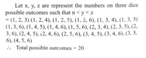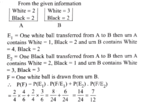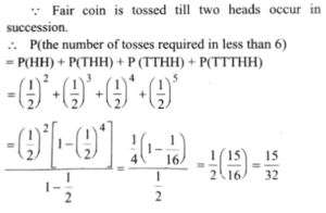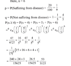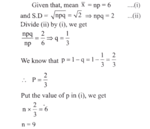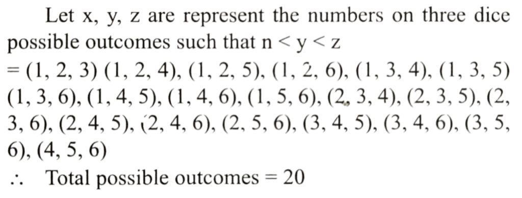 Mathematics (Solved Paper 2024 – II) (101 to 120)Total Questions: 2011. Find the value?(a) 100(b) 95(c) 90(d) 85Correct Answer: (b) 95Solution:12. The mean of the series x₁, x₂,_____xₙ is x. If xₙ is replaced by k, then what is the new mean?(a)(b)(c)(d)Correct Answer: (d)Solution:13. A fair coin is tossed till two heads occur in succession. What is the probability that the number of tosses required is less than 6?(a) 5/64(b) 15/32(c) 31/64(d) 19/32Correct Answer: (b) 15/32Solution:14. Urn A contains 2 white and 2 black balls while urn B contains 3 white and 2 black balls. One ball is transferred from urn A to urn B and then a ball is drawn out of urn B. What is the probability that the ball is white?(a) 11/20(b) 7/12(c) -(d) 1Correct Answer: (b) 7/12Solution:15. For two events A and B, P(A) =P(A|B) = 0.25 and P(B|A) = 0.5. Which of the following are correct?A. A and B are independent. B. P(Aᶜ ∪ Bᶜ ) = 0.875 C. P(Aᶜ ∪ Bᶜ ) = 0.375Select the answer using the code given below.(a) A and B only(b) B and C only(c) A and C only(d) A, B and CCorrect Answer: (d) A, B and CSolution:A and B are independent. P(Aᶜ ∪ Bᶜ ) = 0.875 P(Aᶜ ∪ Bᶜ ) = 0.375 So, all three statements are correct, making option (d) the correct choice.16. Two perfect dice are thrown. What is the probability that the sum of the numbers on the faces is neither 9 nor 10?(a) 1/36(b) 5/36(c) 7/36(d) 29/36Correct Answer: (d) 29/36Solution:n(s) = 6 × 6 = 36Sum of the numbers on the faces 9 = (3,6), (4,5), (5,4), (6,3)Sum of the numbers on the faces 10 : = (4,6), (5,5), (6,4)p (sum 9 or 10 ) = 7/36p (Sum is neither 9 nor 10) = 1 - 7/36 = 29/3617. The occurrence of a disease in an industry is such that the workers have 20% chance of suffering from it. What is the probability that out of 6 workers chosen at random, 4 or more will suffer from the disease?(a) 53/3125(b) 63/3125(c) 73/3125(d) 83/3125Correct Answer: (a) 53/3125Solution:18. Three perfect dice are rolled. Under the condition that no two show the same face, what is the probability that one of the faces shown is an ace (one)?(a) 5/9(b) 2/3(c) 1/3(d) 1/2Correct Answer: (d) 1/2Solution:19. Three perfect dice D₁ , D₂ and D₃ are rolled. Let x, y and z represent the numbers on D₁ , D₂ and D₃ respectively. What is the number of possible outcomes such that x < y < z?(a) 20(b) 18(c) 14(d) 10Correct Answer: (a) 20Solution:20. In a binomial distribution, if the mean is 6 and the standard deviation is √2 then, what are the values of the parameters n and p respectively?(a) 18 and 1/3(b) 9 and 1/3(c) 18 and 2/3(d) 9 and 2/3Correct Answer: (d) 9 and 2/3Solution:Submit Quiz« Previous12