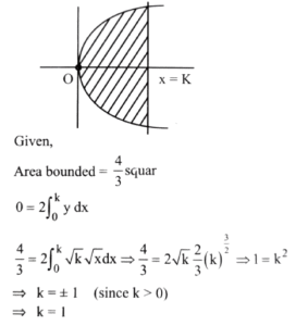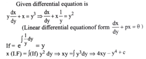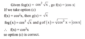 Mathematics (Solved Paper 2024 – II) (51 to 100)Total Questions: 5031. Which one of the following is f(x) ?Let int og(x) = cos²√x and g o f(x)= |cos x|.(a) cos x(b) cos x²(c) cos² x(d) cos |x|Correct Answer: (c) cos² xSolution:32. Which one of the following is g(x) ?Let int og(x) = cos²√x and g o f(x)= |cos x|.(a) √x(b) |x|(c) x²(d) x |x|Correct Answer: (a) √xSolution:If f(x) = cos² x then g(x) = √x,so that fog (x) = cos²√x33. What is f(0.999) + f(1.001) equal to?f(x) = [x]² - [x²].(a) -1(b) 0(c) 1(d) 2Correct Answer: (b) 0Solution:Given f(x) = [x]² - [x²]34. Consider the following statements :f(x) = [x]² - [x²].A. f(x) is continuous at x = 0B. f(x) is continuous at x = 1Which of the statements given above is/are correct?(a) A only(b) B only(c) Both A and B(d) Neither A nor BCorrect Answer: (b) B onlySolution:Given f(x) = [x]² - [x²]35. What is the greatest value of f(x) ?Let f(x) = cos 2x + x on [ -π/2, π/2].(a)(b)(c)(d)Correct Answer: (b)Solution:f(x) = cos2x + x on [-π/2, π/2]f ' (x) = -2 sin 2 x + 1for maxima & minima f '(x) = 0sin 2x = 1/2x = π/12 or 5π/12 (Not in interval) of [-π/2 , π/2]So, maximum value of f(x) occurs at x = π/12 ief(π/12) = cos π/6 + π/12 = √3/2 + π/1236. What is the least value of f(x) ?Let f(x) = cos 2x + x on [ -π/2, π/2].(a)(b)(c)(d)Correct Answer: (b)Solution:f(x) = cos2x + x on [-π/2, π/2]Find the value of f(x) at boundary of interval i.e atx = -π/2 and x = π/2f(-π/2) = -1 + -π/2f(π/2) = -1 + π/2So, minimum value of f(x)² = -[1 + π/2]37. What is the value of k?The area bounded by the parabola y² = kx and the line x = k, where k > 0 is 4/3 square units.(B) 1/2(b) 1(c) √2(d) 2Correct Answer: (b) 1Solution:38. What is the area of the parabola bounded by the latus rectum?The area bounded by the parabola y² = kx and the line x = k, where k > 0 is 4/3 square units.(a) 1/6 square unit(b) square unit 2/3(c) 1 square unit(d) 4/3 square unitCorrect Answer: (a) 1/6 square unitSolution:39. What are the order and degree respectively of the differential equation?Let y dx + (x - y³) dy = 0 be a differential equation.(a) 1 and 1(b) 1 and 2(c) 2 and 1(d) 1 and 3Correct Answer: (a) 1 and 1Solution:40. What is the solution of the differential equation?Let y dx + (x - y³) dy = 0 be a differential equation.(a) y⁴ + 2x = c(b) y⁴ + 3x = c(c) 2xy⁴ + x = c(d) 4xy - y⁴ = cCorrect Answer: (d) 4xy - y⁴ = cSolution:Submit Quiz« Previous12345Next »