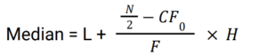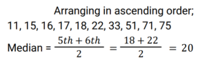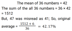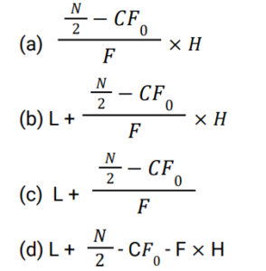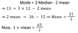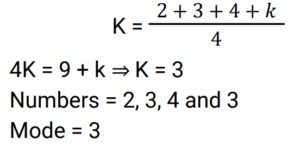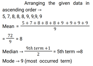 Mean, Median & Mode (Railway Maths) (Part – I)Total Questions: 501. The mean of 36 numbers was found to be 42. Later, it was discovered that a number 47 was misread as 41. Find the correct mean of the given numbers (rounded off to two decimal places). [Group D 17/08/2022 (Afternoon)](a) 43.62(b) 42.17(c) 43.74(d) 42.83Correct Answer: (b) 42.17Solution:2. Find the median of the data 11, 16, 33, 15, 51, 18, 71, 75, 22, 17. [Group D 17/08/2022 (Afternoon)](a) 18(b) 24(c) 20(d) 22Correct Answer: (c) 20Solution:3. A group of class IX students conducted a survey for the number of family members in a household on 40 households in a locality, which resulted in the given frequency table. What is the mode of the data? [Group D 18/08/2022 (Morning) ](a) 6.6(b) 6.7(c) 6.9(d) 6.8Correct Answer: (d) 6.8Solution:4. Find the mode of the data 2, 2, 3, 5, 15, 15, 15, 20, 21, 23, 25, 15, 23, 25. [Group D 18/08/2022 (Afternoon) ](a) 21(b) 25(c) 23(d) 15Correct Answer: (d) 15Solution:2 , 2 , 3 , 5 , 15 , 15 , 15 , 15 , 20 , 21 , 23 , 23 , 25 , 25 Mode = highest frequency of number = 155. Find the median class of: [Group D 18/08/2022 (Evening) ](a) 50 - 100(b) 150 - 200(c) 0 - 50(d) 100 - 150Correct Answer: (a) 50 - 100Solution:6. If the mean of a data is 65 and its mode is 23 then the median using empirical formula is: [Group D 25/08/2022 (Morning) ](a) 53(b) 54(c) 51(d) 52Correct Answer: (c) 51Solution:7. Which is the correct formula for median of grouped data? [Group D 01/09/2022 (Evening) ]Consider: L = lower limit of median class CFₒ = cumulative frequency of preceding class F = frequency of median class H = class width N = the total of frequency (a)(b)(c)(d)Correct Answer: (b)Solution:8. If the median and the mode of a set of data are 12 and 15 respectively, then find the value of thrice of the mean of the same data set. [Group D 26/09/2022 (Evening)](a) 63/2(b) 33/2(c) 35/2(d) 23/2Correct Answer: (a) 63/2Solution:9. Study the following data and find their mode, median and mean in the order mentioned. 8, 9, 8, 5, 9, 8, 9, 7, 9 [Group D 07/10/2022 (Evening)](a) 8, 9, 9(b) 8, 9, 8(c) 9, 9, 9(d) 9, 8, 8Correct Answer: (d) 9, 8, 8Solution:10. If K is the mean of 2, 3, 4, k then the mode is: [Group D 11/10/2022 (Evening) ](a) 4(b) 2(c) 3(d) 1Correct Answer: (c) 3Solution:Submit Quiz12345Next »