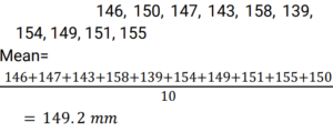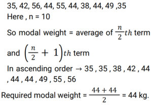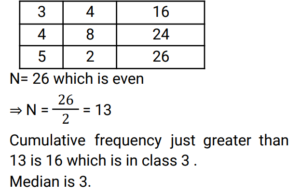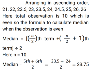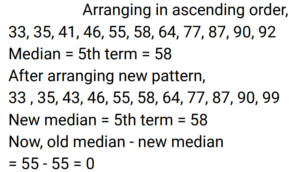 Mean, Median & Mode (Railway Maths) (Part – II)Total Questions: 5011. The following observations are arranged in ascending order. 29, 32, 48, 50, x, x+2, 72, 78, 84, 95 If the median is 63, then the value of x is: [Group D 19/09/2022 (Afternoon)](a) 50(b) 31(c) 62(d) 63Correct Answer: (c) 62Solution:12. First find the median of 46, 64, 87, 41, 58, 77, 35, 90, 55, 92, and 33. If 92 is replaced with 99 and 41 is replaced with 43 in the data, then find the new median. What is the difference between the old median and the new median? [Group D 20/09/2022 (Morning)](a) 2(b) 3(c) 0(d) 6Correct Answer: (c) 0Solution:13. Find the median age, given the ages of 10 persons (in years) are as follows: 22, 23.5, 26, 22.5, 24, 26, 23, 24.5, 25, 21 [Group D 20/09/2022 (Afternoon)](a) 22.00(b) 23.75(c) 25.00(d) 22.25Correct Answer: (b) 23.75Solution:14. The weights (in kg) of 10 students of a class have been recorded as 35, 42, 56, 44, 55, 44, 36, 44, 49 and 35. Find the modal weight. [Group D 20/09/2022 (Evening)](a) 35.5 kg(b) 44.0 kg(c) 35.0 kg(d) 36.0 kgCorrect Answer: (b) 44.0 kgSolution:35, 42, 56, 44, 55, 44, 36, 44, 49 and 65. Hence, mode of the given weights = 44 kg15. What is the sum of the deviations of the values of the data set 5, 6, 7, 9, 10, 12 and 14, from the mean of the values given in the same data set? [Group D 20/09/2022 (Evening)](a) 1(b) -1(c) 2(d) 0Correct Answer: (d) 0Solution:16. The weights (in kg) of 10 students of a class are recorded as 35, 42, 56, 44, 55, 44, 38, 44, 49 and 35. Find the modal weight. [Group D 20/09/2022 (Evening)](a) 36.0 kg(b) 35.5 kg(c) 44.0 kg(d) 35.0 kgCorrect Answer: (c) 44.0 kgSolution:17. Find the mean length of a leaf, given the lengths of 10 leaves (in mm) are as follows: 146, 150, 147, 143, 158, 139, 154, 149, 151, 155 [Group D 22/09/2022 (Afternoon) ](a) 148.2 mm(b) 151.9 mm(c) 139.6 mm(d) 149.2 mmCorrect Answer: (d) 149.2 mmSolution:18. Find the median of the following distribution. [Group D 22/09/2022 (Evening) ](a) 3(b) 4(c) 13(d) 14Correct Answer: (a) 3Solution:19. The data below gives the number of wickets taken by a bowler in 10 different matches. Find the mode of the data. 3, 4, 6, 3, 1, 3, 5, 4, 2, 2. [Group D 26/09/2022 (Afternoon)](a) 4(b) 6(c) 3(d) 2Correct Answer: (c) 3Solution:Arranging in ascending order, 1, 2, 2, 3, 3, 3, 4, 4,5, 6 So, the mode of the given data is 320. The sum of three consecutive numbers is 177. The mean of these three numbers is: [Group D 26/09/2022 (Afternoon)](a) 59(b) 60(c) 57(d) 58Correct Answer: (a) 59Solution:Submit Quiz« Previous12345Next »