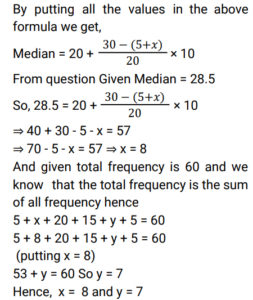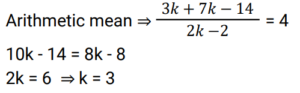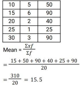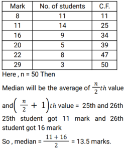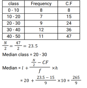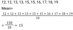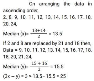 Mean, Median & Mode (Railway Maths) (Part – II)Total Questions: 5021. Find the median of the given frequency distribution. [Group D 26/09/2022 (Evening) ](a) 215/9(b) 85/3(c) 265/9(d) 88/3Correct Answer: (c) 265/9Solution:22. The nominal marks obtained by students who appeared in a test are given below. Find the median marks of the students. [Group D 27/09/2022 (Afternoon) ](a) 13(b) 8(c) 13.5(d) 10.5Correct Answer: (c) 13.5Solution:23. Find the arithmetic mean of the following data. [Group D 27/09/2022 (Evening) ](a) 15.5(b) 13.5(c) 12.5(d) 14.5Correct Answer: (a) 15.5Solution:24. The following are the marks obtained in a test out of 20 by a group of 10 students. Find the mode of the data. 15, 12, 13, 14, 16, 15, 18, 19, 11, 15 [Group D 28/09/2022 (Afternoon) ](a) 18(b) 15(c) 16(d) 19Correct Answer: (b) 15Solution:Given data : 15, 12, 13, 14, 16, 15, 18, 19, 11, 15 as Mode is the most frequent number ∴ Mode = 1525. Find the arithmetic mean of the following data. 12, 13, 18, 12, 15, 15, 16, 13, 19, 17 [Group D 28/09/2022 (Afternoon) ](a) 15.5(b) 14(c) 13.5(d) 15Correct Answer: (d) 15Solution:26. Find the mode of the given frequency distribution [Group D 30/09/2022 (Evening) ](a) 51(b) 7(c) 85(d) 40Correct Answer: (d) 40Solution:The most frequent number is called mode In this frequency distribution chart Mode = 40, which have most frequency i.e 7 .27. The median of the data 9, 12, 11, 8, 16, 18, 10, 14, 15, 13, 17, 20, 2, 24 is x. If 2 and 8 are replaced by 21 and 18 in this data, respectively, then the median of the data so obtained is y. What is the value of (3x – y)? [Group D 06/10/2022 (Afternoon)](a) 23.5(b) 25(c) 24.5(d) 26Correct Answer: (b) 25Solution:28. If the mean and the mode of a data set are 5 and 8, respectively, then, using the relevant empirical relation, find the median of the same data set. [Group D 07/10/2022 (Morning)](a) 6(b) 7(c) 14(d) 3.5Correct Answer: (a) 6Solution:29. The median of the following data is 28.5. The total frequency is 60. The values of x and y, respectively, are: [Group D 07/10/2022 (Morning) ](a) x = 7, y = 8(b) x = 6, y = 9(c) x = 8, y = 7(d) x = 9, y = 6Correct Answer: (c) x = 8, y = 7Solution:30. The variable X takes values 3 and 7, with frequencies of K and K – 2, respectively. If the arithmetic mean of X is 4, then the value of K is: [Group D 11/10/2022 (Morning) ](a) 4(b) 6(c) 5(d) 3Correct Answer: (d) 3Solution:Submit Quiz« Previous12345Next »