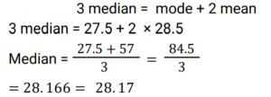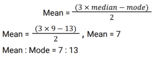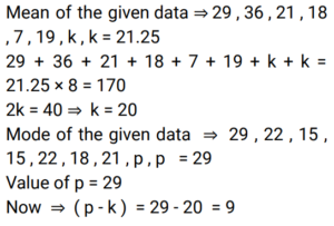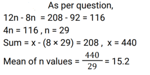 Mean, Median & Mode (Railway Maths) (Part – II)Total Questions: 5031. Find the mode for the following data of student ages: 16, 17, 15, 17, 16, 15, 14, 14, 13, 17, 13, 12, 12, 16, 10, 14, 17, 10, 11. [Group D 11/10/2022 (Evening) ](a) 15(b) 16(c) 17(d) 11Correct Answer: (c) 17Solution:16, 17, 15, 17, 16, 15, 14, 14, 13, 17, 13, 12, 12, 16, 10, 14, 17, 10, 11. On arranging the numbers, 10, 10, 11, 12, 12, 13, 13, 14, 14, 14, 15, 15, 16, 16, 16, 17, 17, 17, 17, So, mode = 1732. The mean of the observations 29, 36, 21, 18, 7, 19, k, k is 21.25 and mode of the observations 29, 22, 15, 22, 18, 21, p, p is 29. Find the value of (p - k). [Level 6 (09/05/2022) Shift 1](a) 12(b) 11(c) 10(d) 9Correct Answer: (d) 9Solution:33. The mean of a certain number of observations is 12. If one observation is removed and the mean remains unaltered, then the removed observation is: [Level 6 (09/05/2022) Shift 2](a) 12(b) 11(c) 13(d) 10Correct Answer: (a) 12Solution:The mean remains unaltered only if the observations having mean equal to original mean is removed. Clearly, here 12 is removed.34. If the median of a, a/2, 2a/3, a/4, 3a/6 is 6, then what is the value of a where a is natural number? [Level 6 (09/05/2022) Shift 2](a) 11(b) 10(c) 9(d) 12Correct Answer: (b) 10Solution:35. The mode and the mean of a grouped data are 27.5 and 28.5 respectively. Find the median, correct to two places of decimal, using empirical relation. [Level 4 (10/05/2022) Shift 1](a) 9.83(b) 19.83(c) 28.17(d) 27.17Correct Answer: (c) 28.17Solution:36. In the data set given below, what is the difference between the Median and the Mode? {2.1, 5, 6, 7, 8, 9.3, 11, 15, 17, 19, 21, 27, 31, 31, 33, 16.5, 14, 10} [Level 5 (12/06/2022) Shift 1](a) 19(b) 17(c) 10(d) 15Correct Answer: (b) 17Solution:On arranging lowest to highest, 2.1, 5, 6, 7, 8, 9.3, 10, 11, 14, 15, 16.5, 17, 19.21, 27, 31, 31, 33 Mode = 31 (Most repeated) Median = 14 , Difference = 31 - 14 = 1737. If assumed mean, a = 142.5, dᵢ = xᵢ − a, fᵢ = frequency of xᵢ, the i-th value Σfᵢdᵢ = 130.5 and Σfᵢ = 90 then find the arithmetic mean of all the values of xᵢ. [Level 2 (13/06/2022) Shift 1](a) 143.5(b) 142.95(c) 142.3(d) 143.95Correct Answer: (d) 143.95Solution:38. If 12 is subtracted from each of n values x₁, x₂, ……, xₙ, then the sum of the resulting numbers is 92. If 8 is subtracted from each of the n values, then the sum of the numbers is 208. What is the mean of the given n values? (Give your answer correct to one decimal place.) [Level 2 (13/06/2022) Shift 1](a) 16.7(b) 13.5(c) 15.2(d) 14.8Correct Answer: (c) 15.2Solution:39. If the ratio of the mode and median is 13 : 9, then find the ratio of the mean and mode using empirical relation. [Level 3 (14/06/2022) Shift 2](a) 9 : 8(b) 8 : 13(c) 8 : 9(d) 7 : 13Correct Answer: (d) 7 : 13Solution:40. What is the Median of 5, 2, 7, 8, 1 and 4 ? [Level 5 (15/06/2022) Shift 1 ](a) 4.5(b) 7(c) 8(d) 7.5Correct Answer: (a) 4.5Solution:On arranging, 1, 2, 4, 5, 7, 8 , Median = 4 + 5/2 = 4.5Submit Quiz« Previous12345Next »