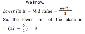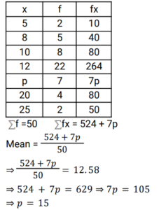 Mean, Median & Mode (Railway Maths) (Part – III)Total Questions: 5011. In a frequency distribution, the mid value of a class is 12 and its width is 6. The lower limit of the class is [RRB NTPC 05/01/2021 (Morning)](a) 12(b) 9(c) 6(d) 18Correct Answer: (b) 9Solution:12. The sum of the class marks of the classes 90–120 and 120–150 is [RRB NTPC 05/01/2021 (Evening)](a) 220(b) 240(c) 170(d) 210Correct Answer: (b) 240Solution:13. If the mean is 25 and the standard deviation is 5 then the coefficient of variation is: [RRB NTPC 07/01/2021 (Evening)](a) 20%(b) 48%(c) 60%(d) 27%Correct Answer: (a) 20%Solution:14. The mean of a, b, c, d, e and f is 36. If the mean of b, d and f is 28, find the mean of a, c and e. [RRB NTPC 08/01/2021 (Evening)](a) 30(b) 42(c) 44(d) 32Correct Answer: (c) 44Solution:15. The following are the weights (in kg) of 25 students, 58, 55, 53, 50, 53, 51, 52, 54, 53, 52, 54, 53, 58, 53, 59, 55, 53, 52, 51, 54, 53, 59, 55, 53, 52. What is the weight (in kg) of the heaviest student? [RRB NTPC 09/01/2021 (Morning)](a) 59(b) 58(c) 56(d) 55Correct Answer: (a) 59Solution:= The weight of the heaviest student is 59 kg.16. The following are the weights (in kg) of 25 students, 58, 55, 53, 50, 53, 51, 52, 54, 53, 52, 54, 53, 58, 53, 59, 55, 53, 52, 51, 54, 53, 59, 55, 53, 52. What is the most commonly observed weight (in kg)? [RRB NTPC 09/01/2021 (Morning)](a) 52(b) 54(c) 53(d) 55Correct Answer: (c) 53Solution:The most commonly observed weight is 53 kg.17. The following are the weights (in kg) of 25 students. 58, 55, 53, 50, 53, 51, 52, 54, 53, 52, 54, 53, 58, 53, 59, 55, 53, 52, 51, 54, 53, 59, 55, 53, 52. Among the following options, what is the weight (in kg) that appears least number of times in the given data? [RRB NTPC 09/01/2021 (Morning)](a) 50(b) 54(c) 58(d) 52Correct Answer: (a) 50Solution:The weight (in kg) that appears the least number of times in the given data is 50 kg.18. The following are the weights (in kg) of 25 students. 58, 55, 53, 50, 53, 51, 52, 54, 53, 52, 54, 53, 58, 53, 59, 55, 53, 52, 51, 54, 53, 59, 55, 53, 52. What is the range of the given data? [RRB NTPC 09/01/2021 (Morning)](a) 6(b) 7(c) 9(d) 8Correct Answer: (c) 9Solution:The range of the given data is (Max weight - Min weight) = (59 - 50) = 919. If the mean of the following data is 11, find the value of k. 11, 19, 5, 10, k, 13, 12, 8, 15, 14 [RRB NTPC 10/01/2021 (Morning)](a) 3(b) 13(c) 12(d) 11Correct Answer: (a) 3Solution:20. Find the missing value of p for the following distribution, whose mean is 12.58 [RRB NTPC 11/01/2021 (Morning) ](a) 15(b) 10(c) 20(d) 13Correct Answer: (a) 15Solution:Submit Quiz« Previous12345Next »