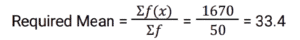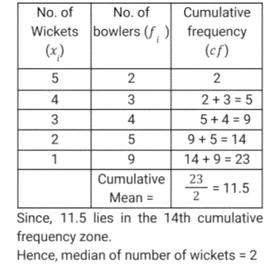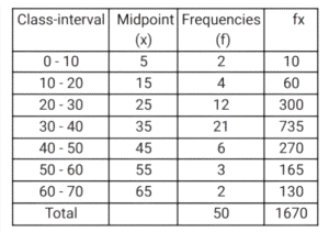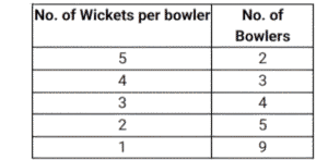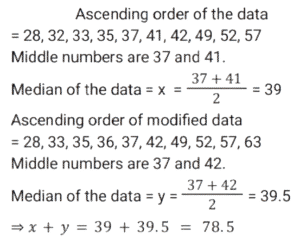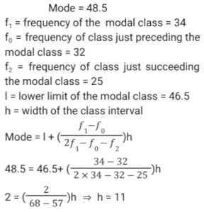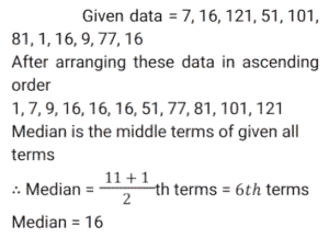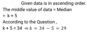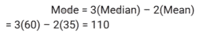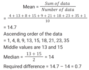 Mean, Median & ModeTotal Questions: 531. The runs scored by 11 players in the cricket match are as follows. [SSC CHSL Tier II (10/01/2024)]7, 16, 121, 51, 101, 81, 1, 16, 9, 11, 16 Calculate the median of the data.(a) 51(b) 11(c) 2(d) 16Correct Answer: (d) 16Solution:2. A set of data presented in the form of a frequency distribution table with class intervals and their respective frequencies had a mode of 48.5. The lower boundary of the modal class was 46.5; the frequency of the modal class was 34; the frequency of the class interval just preceding the modal class was 32 and the frequency of the class interval just succeeding the modal class was 25. What was the width of the modal class? [SSC CGL Tier II (26/10/2023)](a) 12(b) 10.5(c) 11(d) 10Correct Answer: (c) 11Solution:3. Calculate the mean from the following table. [SSC CPO 10/11/2022 (Evening)]ScoresFrequencies0 – 10210 – 20420 – 301230 – 402140 – 50650 – 60360 – 702(a) 33.4(b) 32.6(c) 35.8(d) 34.2Correct Answer: (a) 33.4Solution: 4. Let x be the median of data: 33, 42, 28, 49, 32, 37, 52, 57, 35, 41. If 32 is replaced by 36 and 41 by 63, then the median of the data, so obtained, is y. What is the value of (x + y) ? [SSC MTS 19/08/2019 (Evening)](a) 78(b) 78.5(c) 79.5(d) 79Correct Answer: (b) 78.5Solution:5. A set of data is given. The mean of the set is 35 while the median is set as 60. Find the mode of the data. [SSC MTS 14/08/2019 (Morning)](a) 25(b) 30(c) 20(d) 110Correct Answer: (d) 110Solution:6. The marks of Nine students in ascending order for a test are given below with Median as 34, the value of k is: 12, 16, k, 28, k + 5, 32, 39, 47, 53. [SSC MTS 09/08/2019 (Afternoon)](a) 29(b) 27(c) 30(d) 32Correct Answer: (a) 29Solution:7. What is the difference of mean and median of the given data? 4, 13, 8, 15, 9, 21, 18, 23, 35, 1? [SSC MTS 08/08/2019 (Morning)](a) 0.7(b) 1.7(c) 1.2(d) 2.1Correct Answer: (a) 0.7Solution:8. The data below shows the number of wickets taken by each bowler and the number of bowlers who took them. [SSC MTS 07/08/2019 (Afternoon)]What is the median of the number of wickets?(a) 3(b) 2(c) 4(d) 2.5Correct Answer: (b) 2Solution:9. In the data given below, the number of sixes and the batsmen who hit them, has been shown. [SSC MTS 06/08/2019 (Morning)]What is the median of the number of sixes ?(a) 3(b) 5(c) 4(d) 4.5Correct Answer: (a) 3Solution: will be 3.10. What is the mode of the given data 4, 3, 4, 3, 2, 2, 2, 5, 5, 3, 4, 6, 4, 3, 3 [SSC MTS 05/08/2019 (Afternoon)](a) 4(b) 3(c) 2(d) 5Correct Answer: (b) 3Solution:The mode is the number that is repeated most often. Here 3 is repeated the maximum number of times (5) so the mode will be 3.Submit Quiz123456Next »