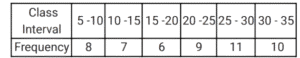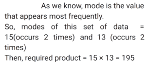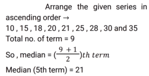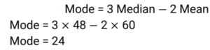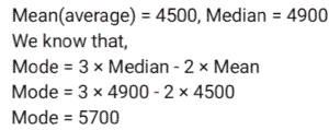 Mean, Median & ModeTotal Questions: 5321. Find the mode of the given data. 21, 15, 16, 48, 6, 15, 44, 16, 6, 5, 15, 16, 21, 6, 15 and 43 [SSC CHSL Tier II (02/11/2023)](a) 16(b) 21(c) 6(d) 15Correct Answer: (d) 15Solution:22. The distribution of 100 workmen employed in a factory according to their monthly salary, showed an average salary of ₹4,500 per month. If the median salary is found to be ₹4,900, find the mode salary. [SSC CHSL Tier II (10/01/2024)](a) ₹5,600(b) ₹5,500(c) ₹5,700(d) ₹5,800Correct Answer: (c) ₹5,700Solution:23. The marks obtained by 15 students out of a maximum of 25 in a test are given as 13, 11, 16, 15, 18, 12, 13, 14, 10, 22, 15, 21, 20, 17 and 24. Find the product of the modes of this set of data. [SSC CGL Tier II (26/10/2023)](a) 192(b) 210(c) 182(d) 195Correct Answer: (d) 195Solution:24. The mean of 23 observations is 36. If the mean of the first 12 observations is 32 and that of the last 12 observations is 39, find the 12ᵗʰ observation. [SSC MTS 11/09/2023 (2nd Shift)](a) 26(b) 23(c) 24(d) 25Correct Answer: (c) 24Solution:25. Given below is the observed data of the age of various boys. Study the table carefully and answer the question that follows. [SSC CHSL 11/08/2023 (2nd Shift)](a) 6.57(b) 9.57(c) 7.57(d) 8.57Correct Answer: (c) 7.57Solution:26. Find the median of the following data. 15, 30, 20, 10, 25, 35, 18, 21, 28 [SSC CHSL Tier II (26/06/2023)](a) 30(b) 18(c) 25(d) 21Correct Answer: (d) 21Solution:27. Find the median of the following data. 129.75, 116.6, 12.3, 114.1, 136.6, 118.7, 13.5, 121.3 [SSC CHSL Tier II (26/06/2023)](a) 116.60(b) 117.65(c) 118.75(d) 127.80Correct Answer: (b) 117.65Solution:28. Find the mode for the given distribution (rounded off to two decimal places). [SSC CGL Tier II (02/03/2023)](a) 35.25(b) 40.25(c) 30.33(d) 28.33Correct Answer: (d) 28.33Solution: 29. Find the standard deviation of the following data (rounded off to two decimal places). 5, 3, 4, 7 [SSC CGL Tier II (03/03/2023)](a) 1.48(b) 3.21(c) 4.12(d) 2.45Correct Answer: (a) 1.48Solution:30. For a sample data, mean = 60 and median = 48. For this distribution, the mode is: [SSC CGL Tier II (06/03/2023)](a) 18(b) 48(c) 36(d) 24Correct Answer: (d) 24Solution:Submit Quiz« Previous123456Next »