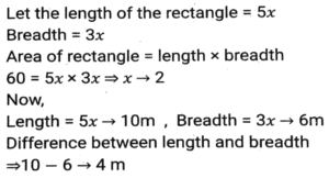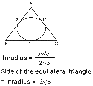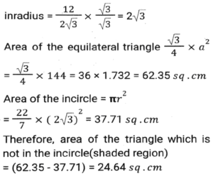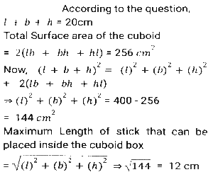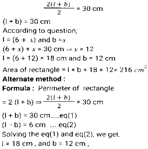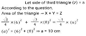 Mensuration (Part-10)Total Questions: 5041. There is a rectangular garden of 240 metres x 80 metres. A path of width 4 metres is build outside the garden along its four sides. What is the area of the path? [SSC CHSL 10/03/2023 (4th Shift)](a) 2826 metre²(b) 2542 metre²(c) 2916 metre²(d) 2624 metre²Correct Answer: (d) 2624 metre²Solution:42. The sum of the length, breadth, and height of a cuboid box is 20 cm and the total surface area of cuboid is 256 sq . cm. What is the maximum length (in approximate) of a stick that can be placed inside the cuboid box? [SSC CHSL 13/03/2023 (2nd Shift)](a) 32 cm(b) 24 cm(c) 16 cm(d) 12 cmCorrect Answer: (d) 12 cmSolution:43. X, Y and Z are three equilateral triangles. The sum of the areas of X and Y is equal to the area of Z. If the side lengths of X and Y are 6 cm and 8 cm respectively, then what is the side length of Z? [SSC CHSL 13/03/2023 (2nd Shift)](a) 10.5 cm(b) 10 cm(c) 9.5 cm(d) 9 cmCorrect Answer: (b) 10 cmSolution:44. An incircle with center O is drawn inside an equilateral triangle ABC and the length of the side is 12 cm. Find the area (in sq.cm) of the triangle which is not in the incircle. [SSC CHSL 13/03/2023 (2nd Shift)](a) 21.48(b) 30.64(c) 37.71(d) 24.64Correct Answer: (d) 24.64Solution:45. What is the area of a rhombus whose diagonals are of 8 cm and 13 cm? [SSC CHSL 13/03/2023 (4th Shift)](a) 52 cm²(b) 96 cm²(c) 44 cm²(d) 84 cm²Correct Answer: (a) 52 cm²Solution:46. If the radius of a sphere is thrice than the radius of a hemisphere, then what will be the respective ratio of their volumes ? [SSC CHSL 14/03/2023 (1st Shift)](a) 27 : 1(b) 16 : 1(c) 54 : 1(d) 18 : 1Correct Answer: (c) 54 : 1Solution:47. The ratio of the volume of the first and second cylinder is 32 : 9 and the ratio of their heights is 8 : 9. If the area of the base of the second cylinder is 616 cm², then what will be the radius of the first cylinder ? [SSC CHSL 14/03/2023 (2nd Shift)](a) 24 cm(b) 20 cm(c) 28 cm(d) 36 cmCorrect Answer: (c) 28 cmSolution:48. Half of the perimeter of a rectangle is 30 cm. If the length of the rectangle is 6 cm more than its breadth, then what is the area of the rectangle? [SSC CHSL 14/03/2023 (4th Shift)](a) 216 cm²(b) 250 cm²(c) 185 cm²(d) 195 cm²Correct Answer: (a) 216 cm²Solution:49. If the square of product of three sides of the triangle is 1024 units and the area of its circumcircle is 16π, what is the area of the given triangle? [SSC CHSL 15/03/2023 (1st Shift)](a) 2 sq . units(b) 3 sq . units(c) 2.5 sq . units(d) 4 sq . unitsCorrect Answer: (a) 2 sq . unitsSolution:50. The breadth of a rectangular floor is 3/5 of its length. If the area of the floor is 60 meter², then what is the diffrence between the length and breadth of the floor? [SSC CHSL 15/03/2023 (2nd Shift)](a) 6 m(b) 7.5 m(c) 5m(d) 4 mCorrect Answer: (d) 4 mSolution:Submit Quiz« Previous12345